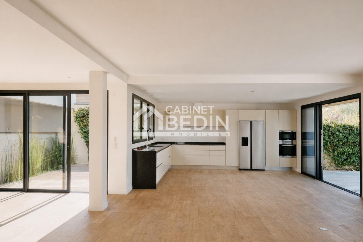 Exclusivité CABINET BEDIN - LE BOUSCAT - Maison d'architecte 5 chambres . Idéalement située dans une impasse calme du quartier Lafon Féline au Bouscat, à proximité des commerces, des écoles et des transports, cette maison non-mitoyenne, d'environ 205m2 habitables, offre un cadre de vie verdoyant. Edifiée sur une belle parcelle arborée de 474m2, elle dispose d'un jardin, d'une terrasse convivale et d'un carport. La maison se compose au rez-de-chaussée d'un patio, d'une entrée avec rangements donnant sur une lumineuse pièce de vie avec cuisine ouverte d'environ 75m2, ouvrant directement sur la terrasse et le jardin exposé sud-ouest. On y trouve également une buanderie, des wc séparés ainsi qu'une suite avec dressing et salle d'eau. L'étage accueille une belle suite parentale avec salle de bains, trois autres chambres, une salle d'eau et des wc séparés. Construite en 2017 avec des matérieux de qualité, cette maison familiale séduit par ses finitions soignées et sa domotique et fibre intégrées, alliant confort moderne et fonctionnalité. Tramway D à 10 minutes à pied, bus à proximité.