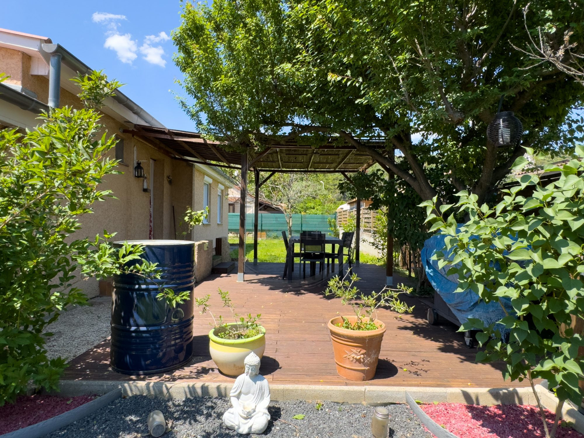 À l'extérieur, vous profiterez d'un terrain plat de 616m2 clos et arboré, bénéficiant de l'eau de forage avec 2 terrasses aménagées pour les beaux jours.