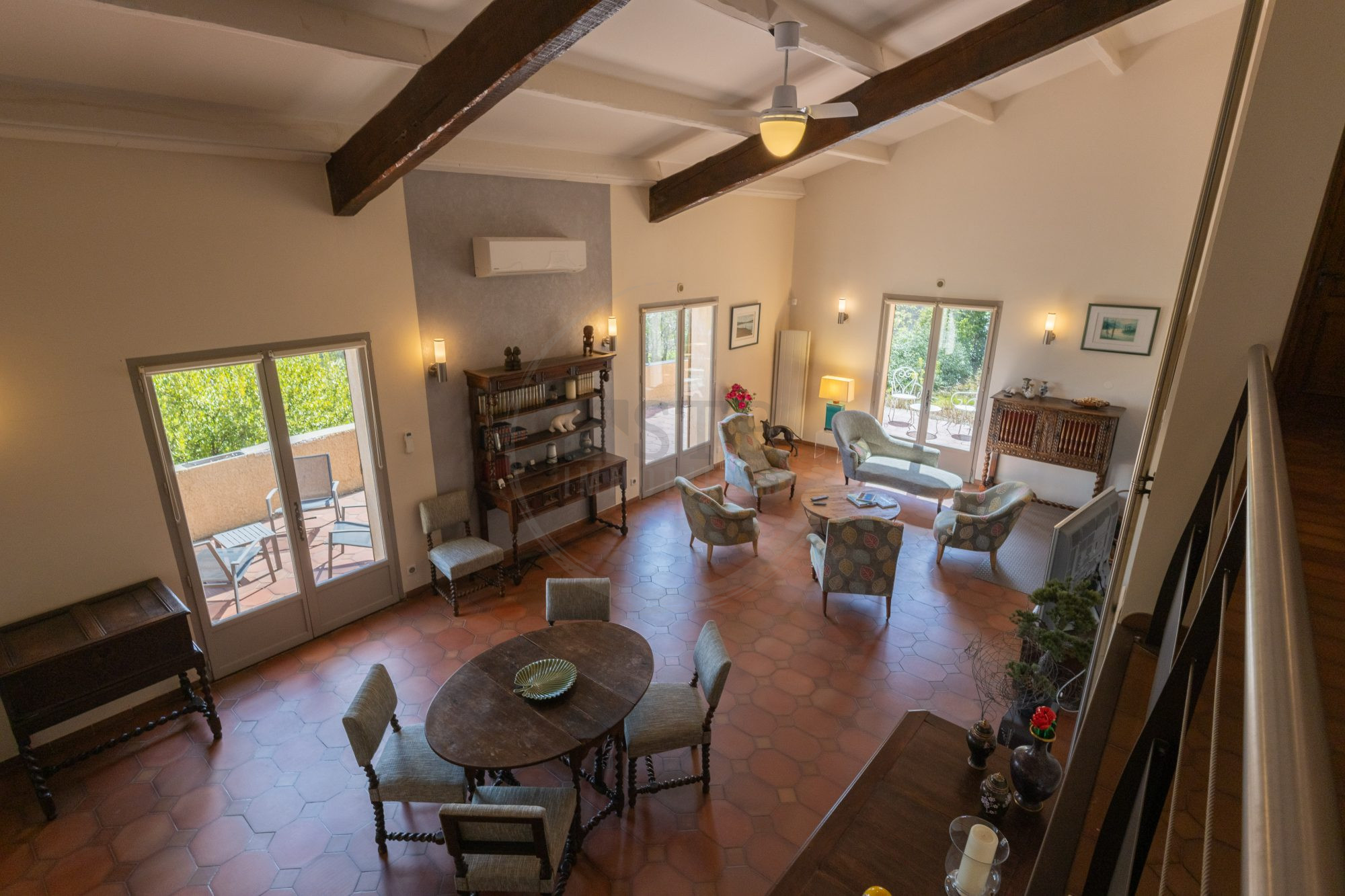 À l'extérieur, le jardin en restanques soigneusement aménagé propose différentes ambiances de terrasses, un jacuzzi et une piscine intérieure chauffée par pompe à chaleur, ouverte sur l'extérieur grâce à de larges ouvertures vitrées.