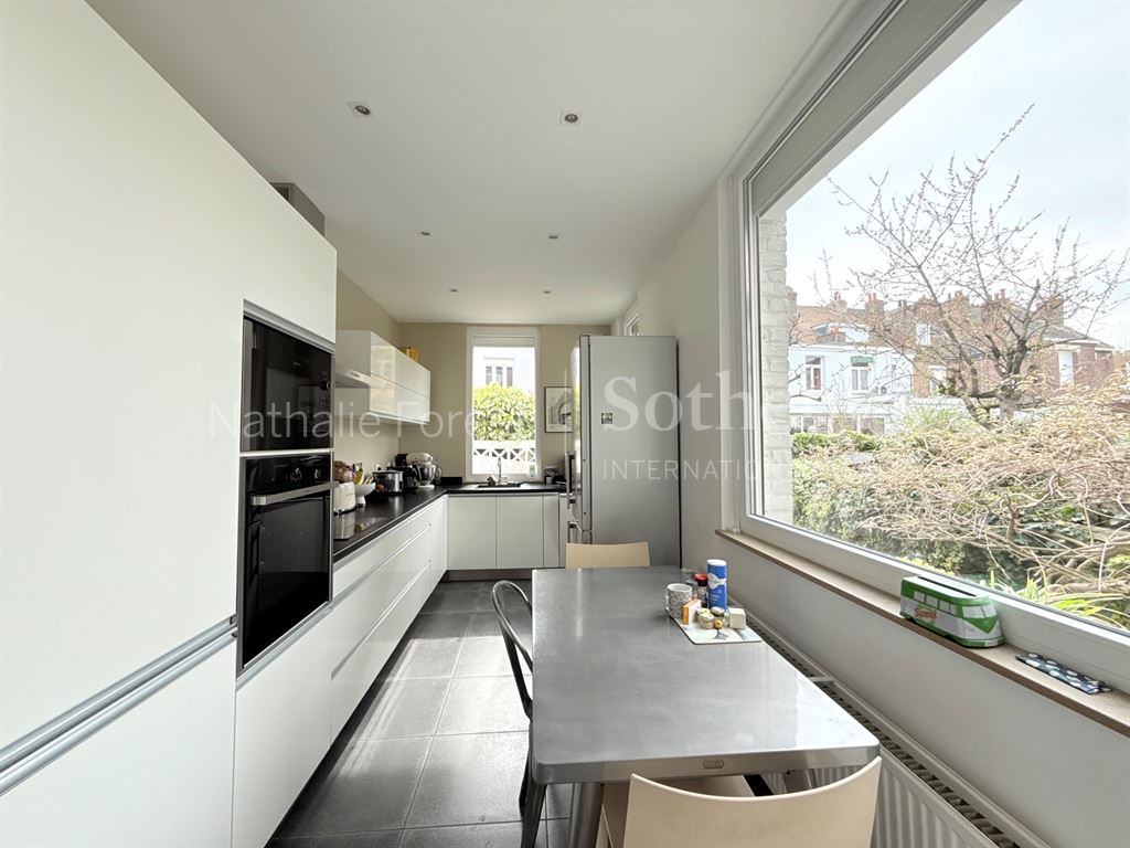 Le large hall d'entrée s'ouvre sur le double espace de réception de 33m2 avec parquet chevron, cheminée fonctionnelle et belle hauteur sous plafond (moulures). Celui-ci se prolonge sous une veranda puis un bel extérieur exposé au Sud. Jolie cuisine séparée de 13m2 avec espace de travail en granit, nombreux rangements et espace repas journalier. WC