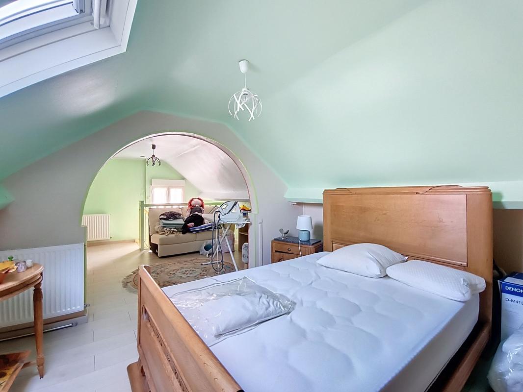 À l'étage, une grande chambre vient compléter l'ensemble, parfaite pour une suite parentale, un bureau ou un espace nuit supplémentaire.
