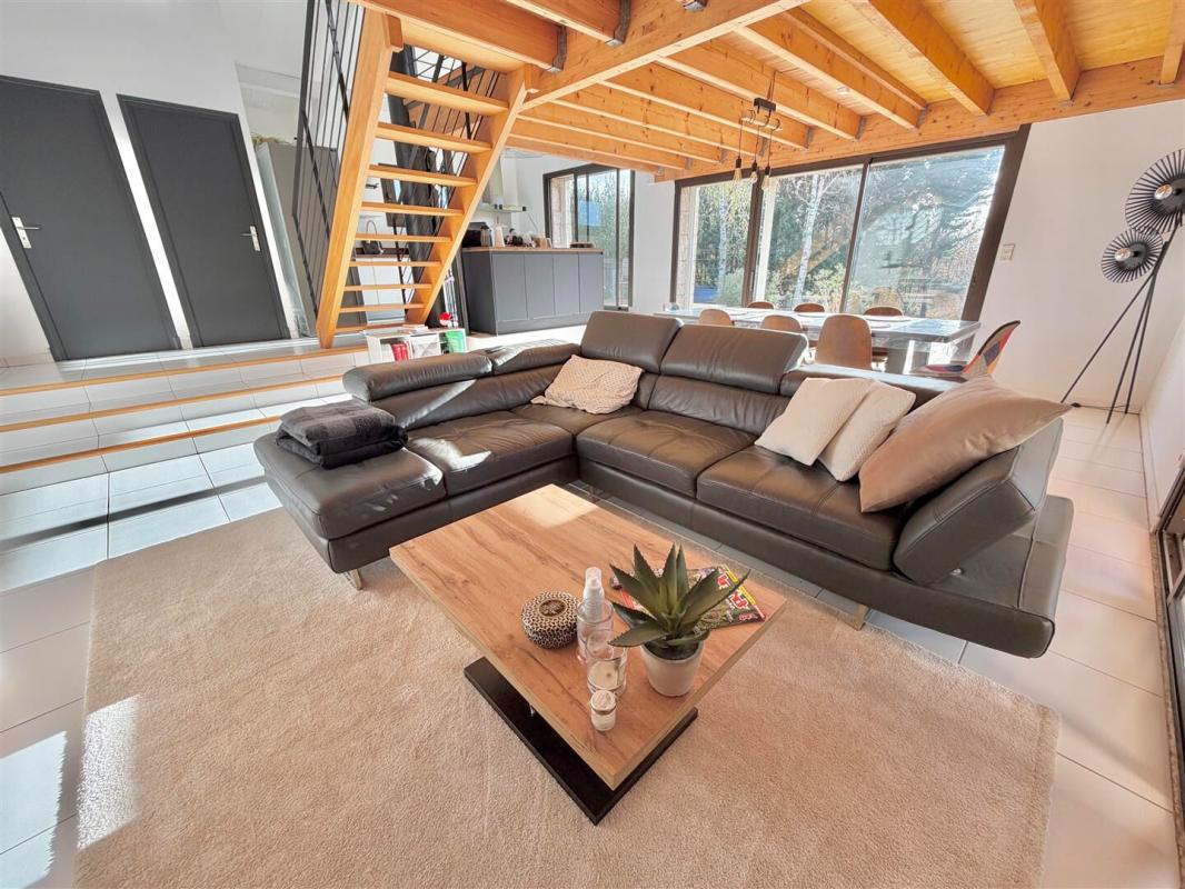 Surplombant la pièce à vivre, une mezzanine de plus de 30m² offre un espace supplémentaire modulable selon vos besoins (4ème chambre, bibliothèque, bureau, salle de jeux, espace détente...).