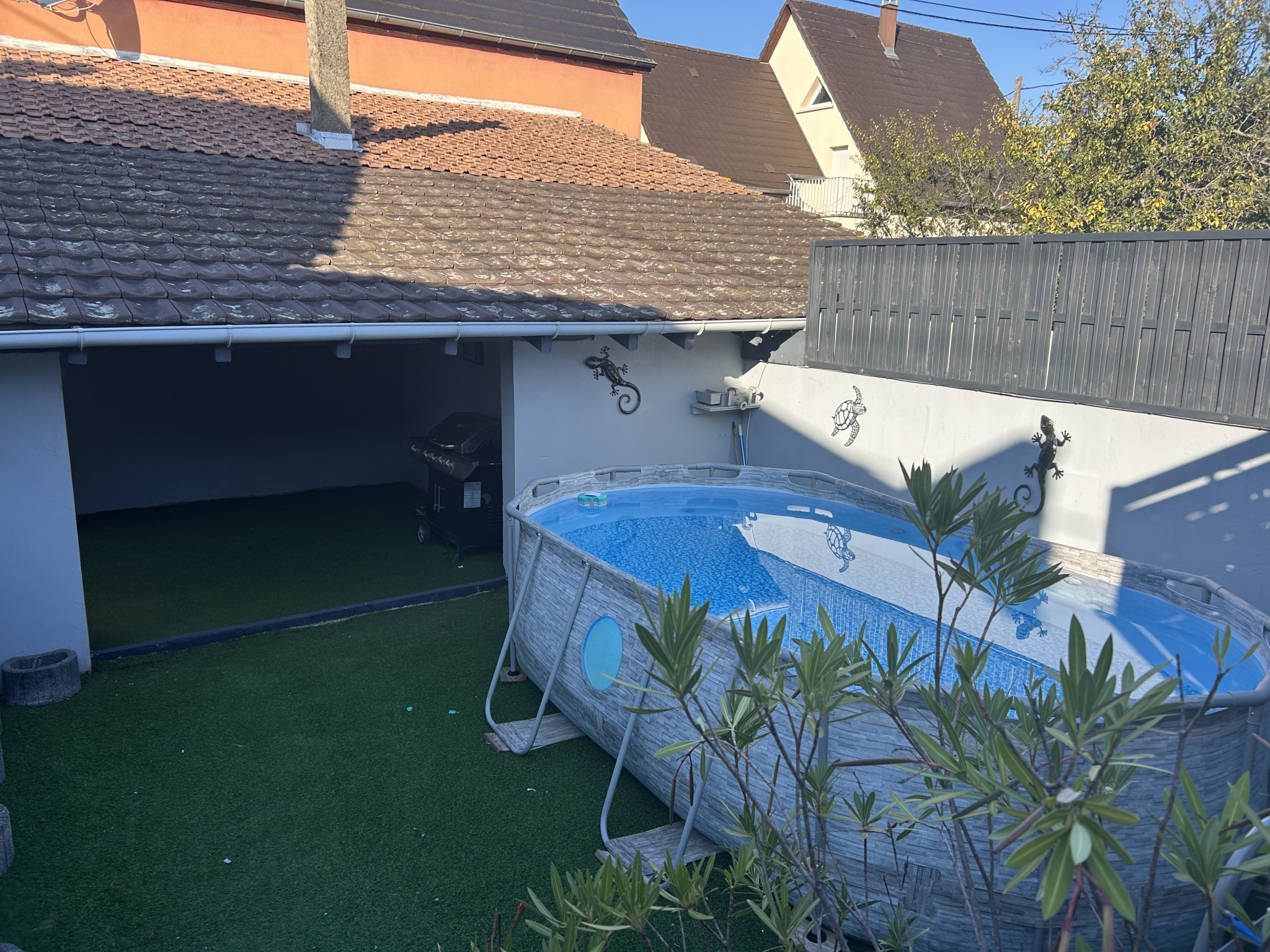 Cette maison vous permettra de profiter d'un espace extérieur sans vis à vis avec une belle terrasse de 40m2, et une cour intérieure aménagée avec une pisicine hors sol.