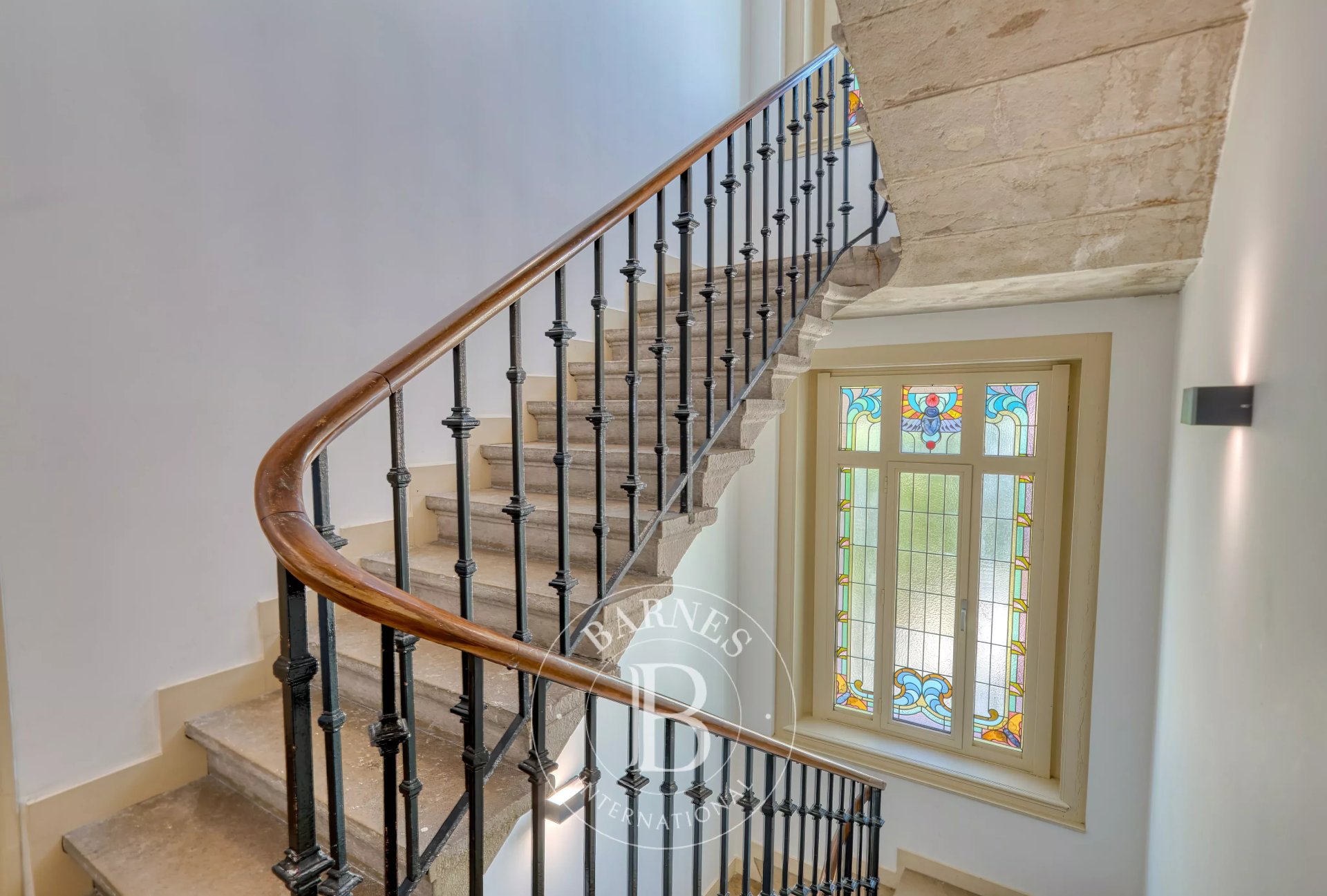 Dès l’entrée dans la maison, le charme opère grâce à un hall ayant conservé toute son authenticité : carreaux de ciment, vitraux, escalier en pierre avec garde-corps, portes en bois…