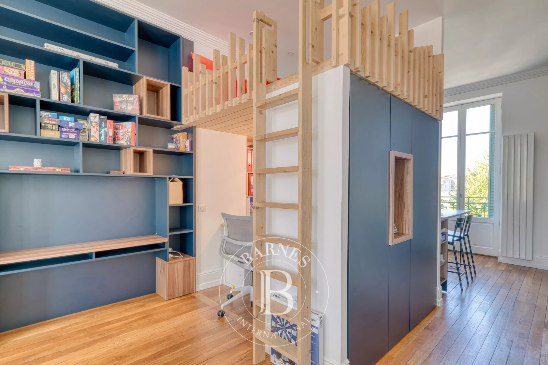 Un coin bureau ainsi qu’un espace de jeu pour les enfants complètent l’ensemble. Deux balcons permettent de profiter d’une vue sur le parc, orientation Est-Ouest.
