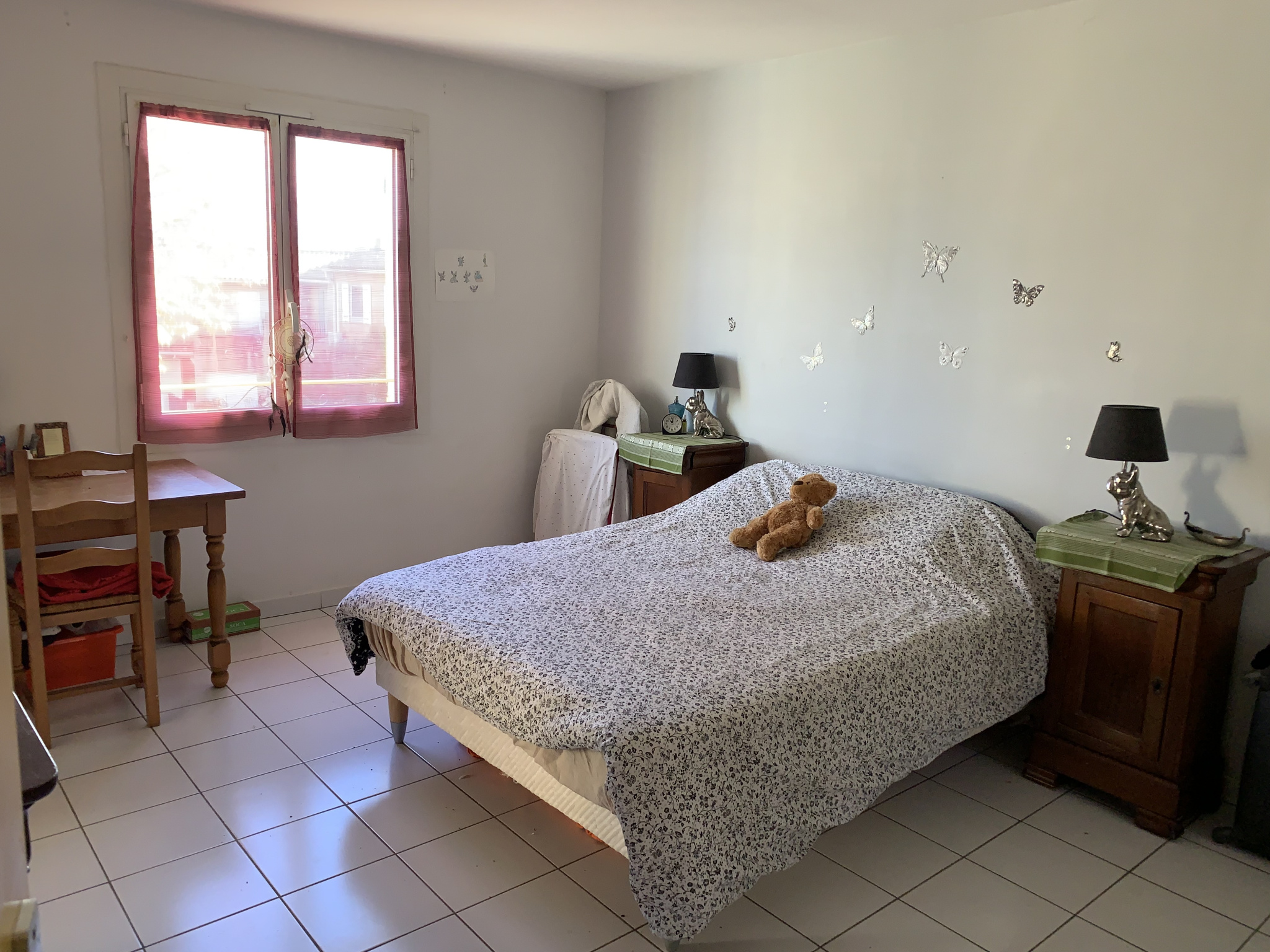 À l'étage, vous trouverez un dégagement desservant deux grandes chambres avec placards, dont l'une bénéficie d'une terrasse couverte, une salle de bains ainsi qu'un wc indépendant.