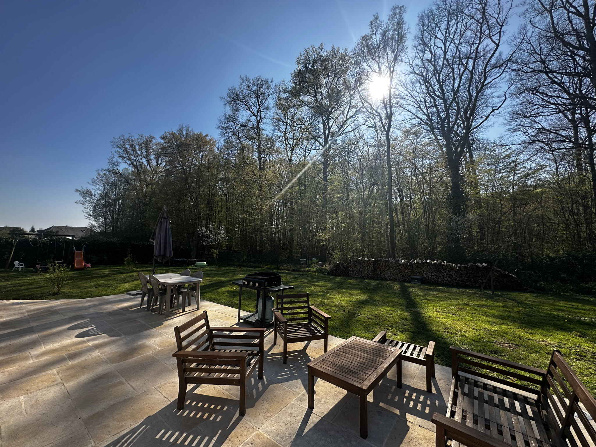 A l'extérieur vous profiterez d'un magnifique jardin à l'arrière de la maison avec une terrasse donnant sur la forêt, idéal pour profiter du calme et de la nature.
