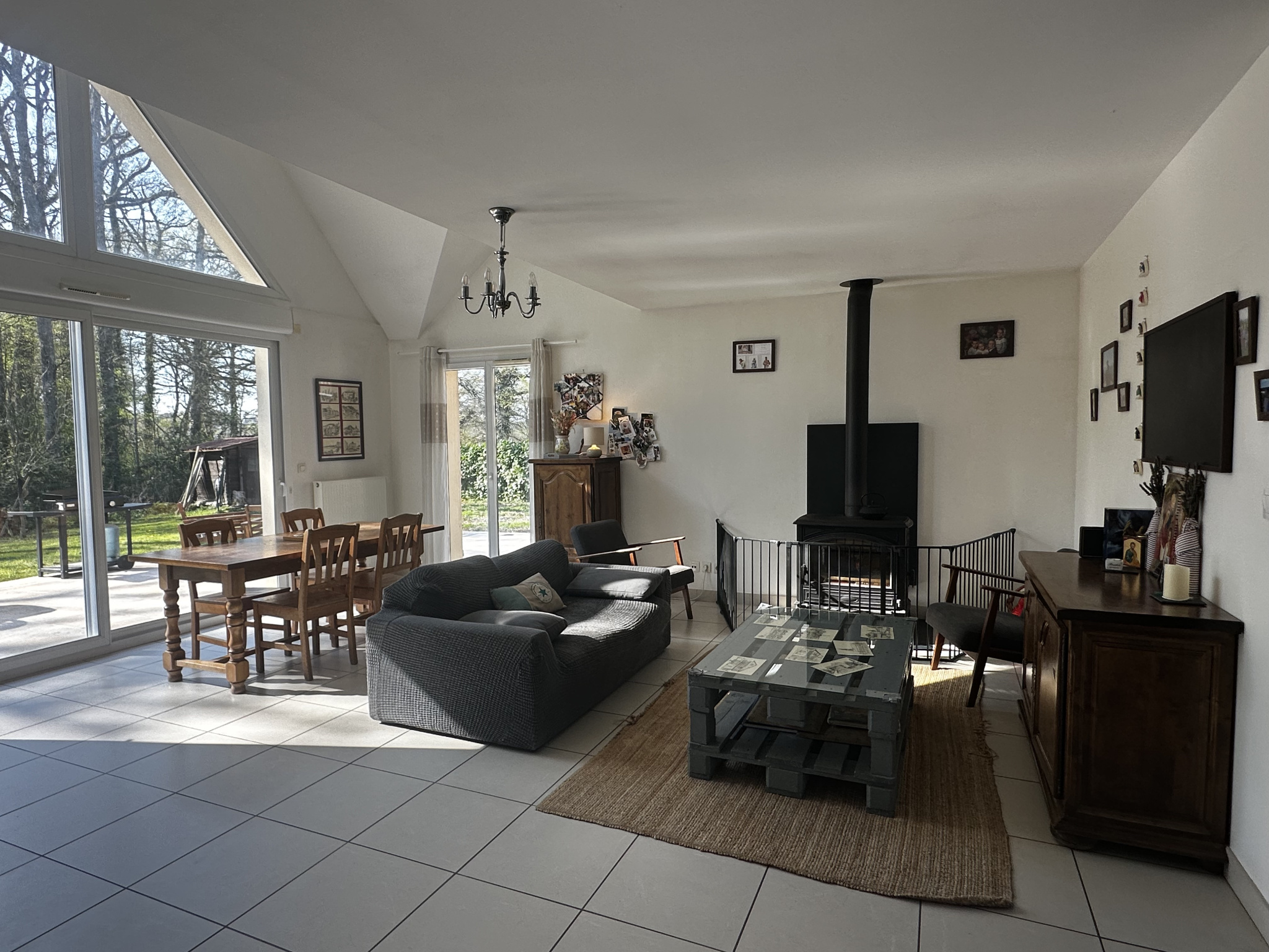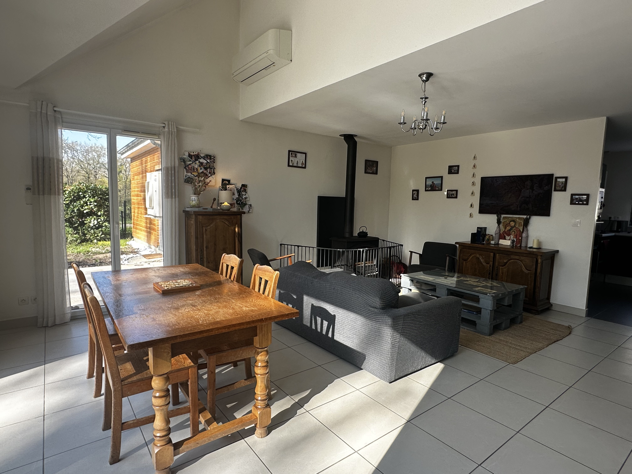 La maison se compose d'une entrée avec placard, d'une cuisine aménagée et équipée, d'un cellier, ainsi que d'un spacieux salon séjour de 34 m2 offrant un bel espace de vie lumineux et chaleureux avec un poêle à bois.