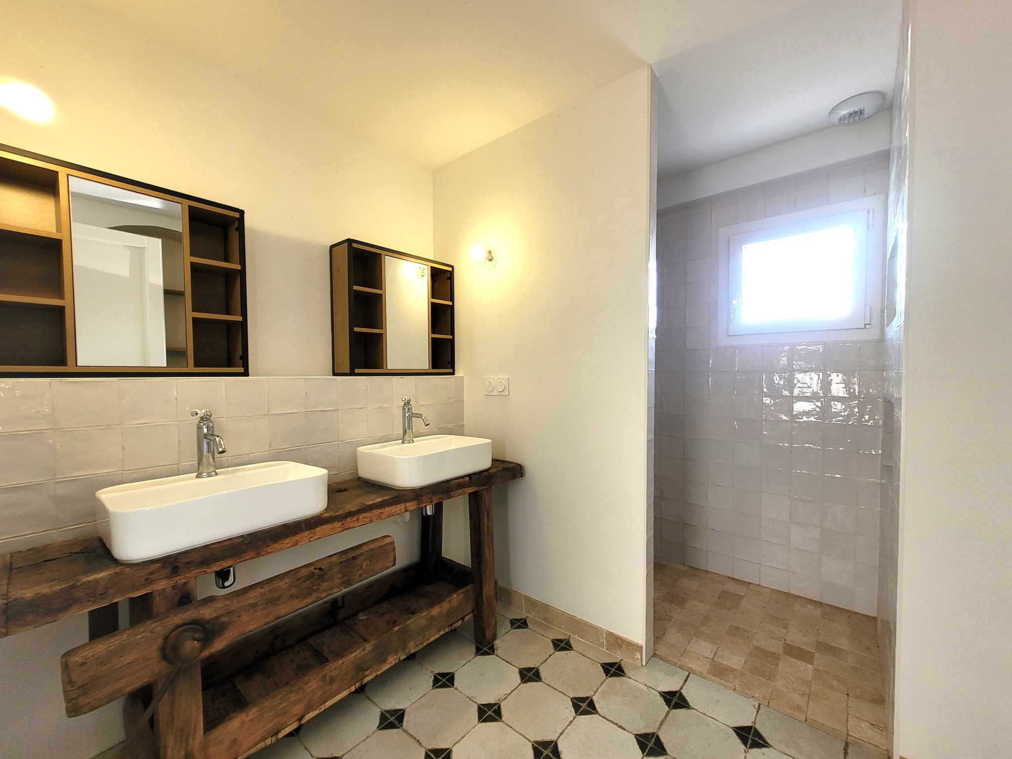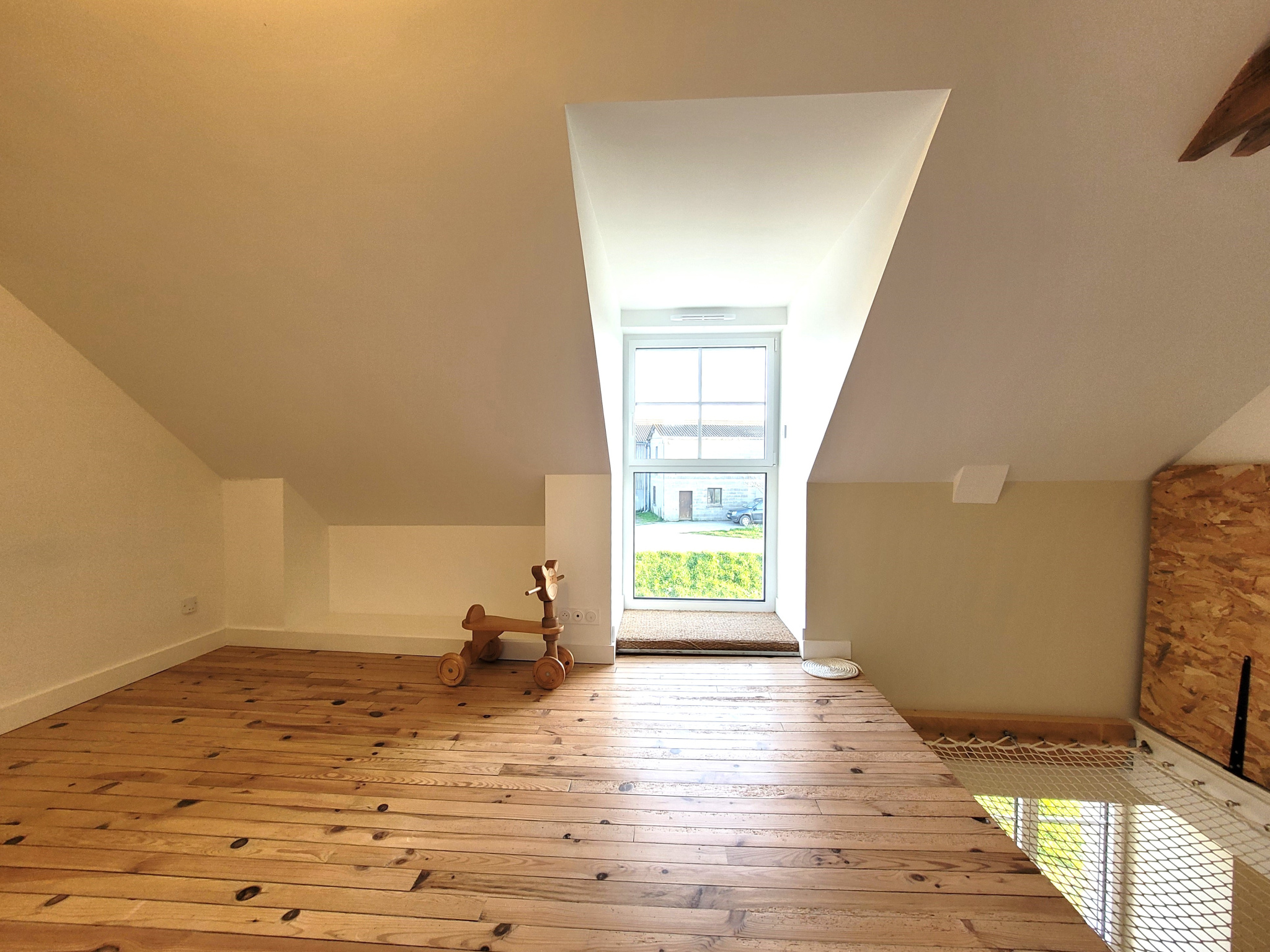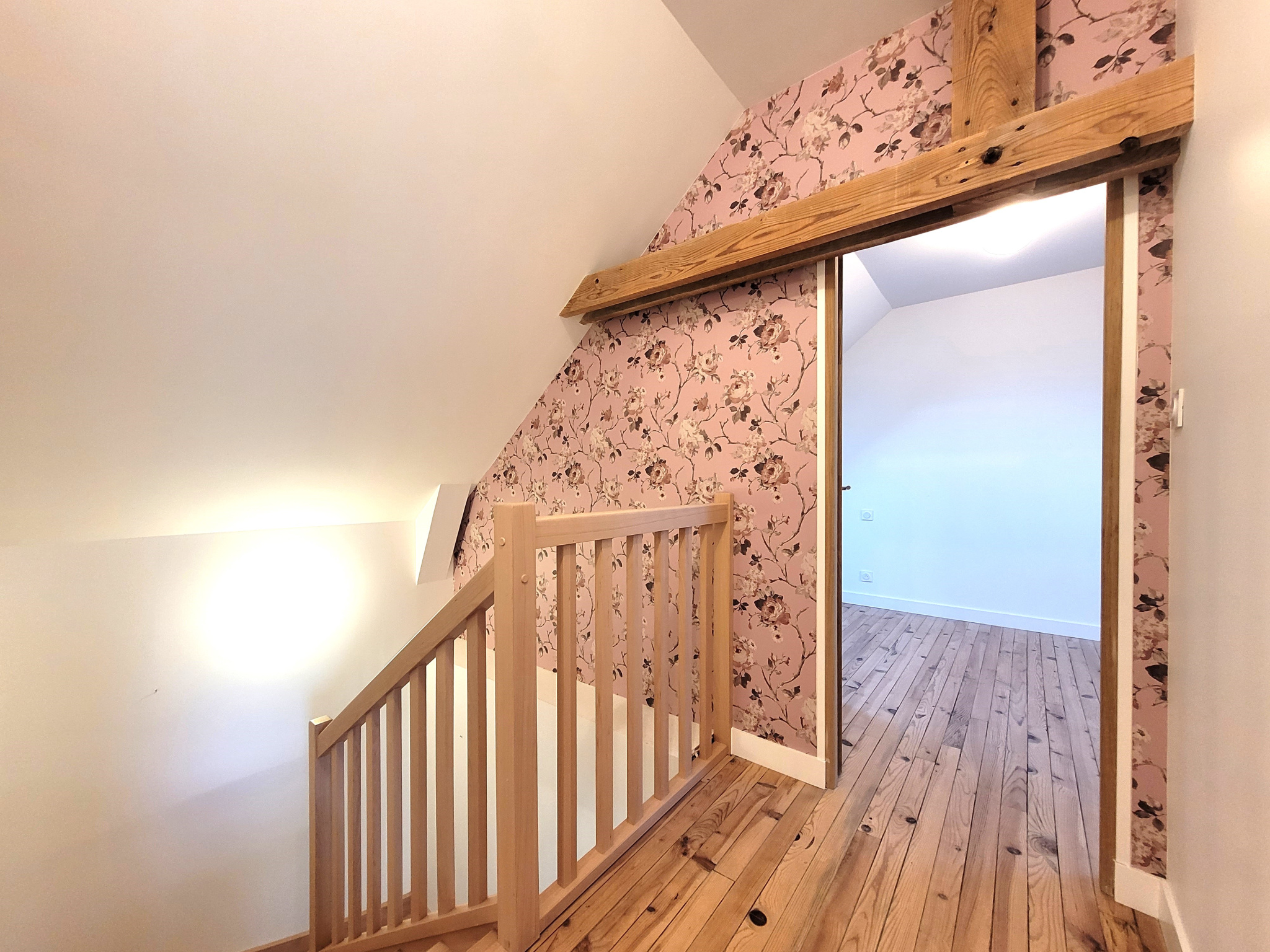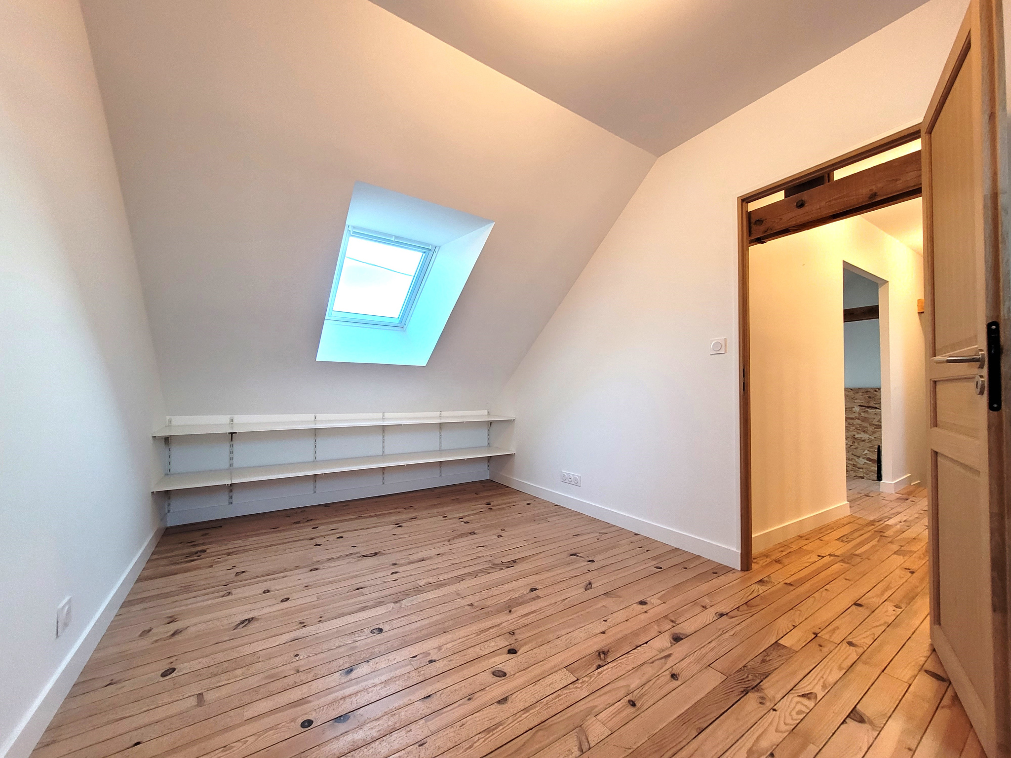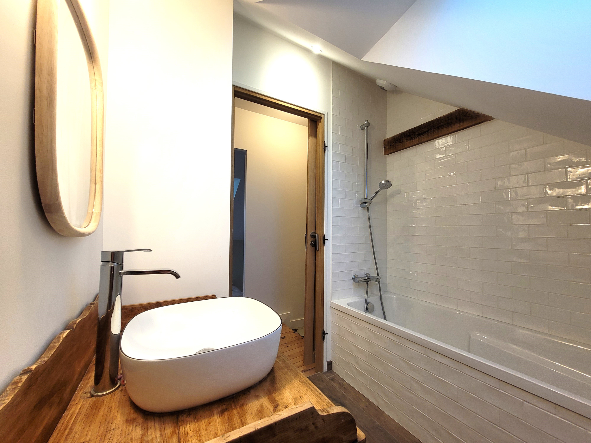 À l'étage, trois chambres spacieuses sur parquet massif dont une avec coin lecture sur filet, une salle de bains avec baignoire et un wc.