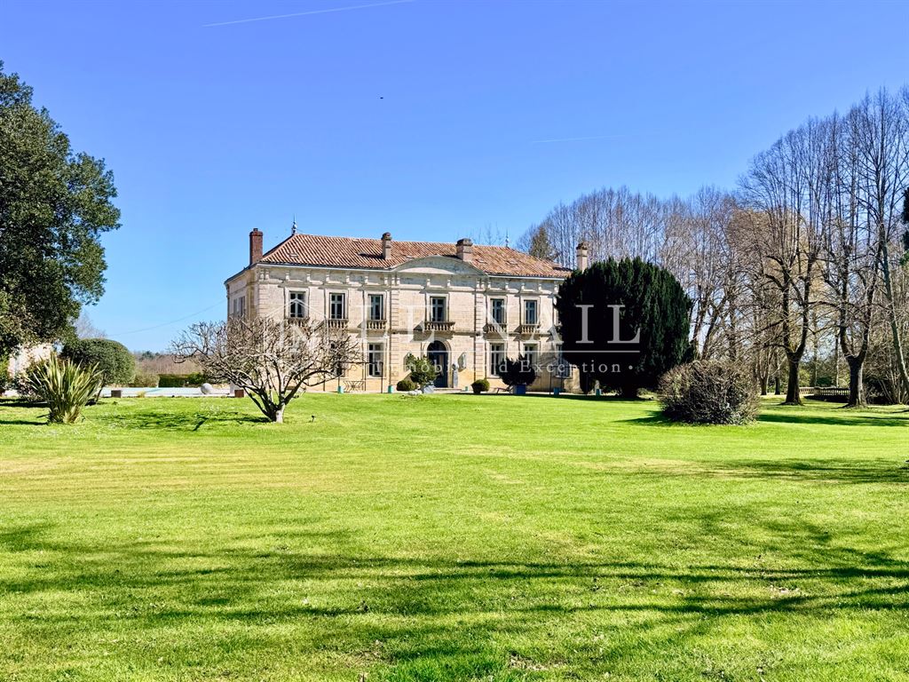 Chargé d’histoire, ce château appartient à la même famille depuis plus de deux siècles. Ses origines remontent à la fin du XVIIIe siècle, dont il conserve encore aujourd’hui les bases architecturales, témoignant de son authenticité et de son caractère intemporel. Cette élégante demeure de caractère présente une architecture classique d’inspiration néoclassique, parfaitement symétrique, développée sur deux niveaux principaux. La façade principale, ordonnancée avec rigueur, se distingue par son axe central marqué par une porte d’entrée en arc plein cintre, encadrée de niches et surmontée d’un léger fronton cintré. L’ensemble est rythmé par de larges ouvertures verticales, harmonieusement alignées, certaines agrémentées de garde-corps en pierre formant de petits balcons, apportant relief et raffinement à la composition.