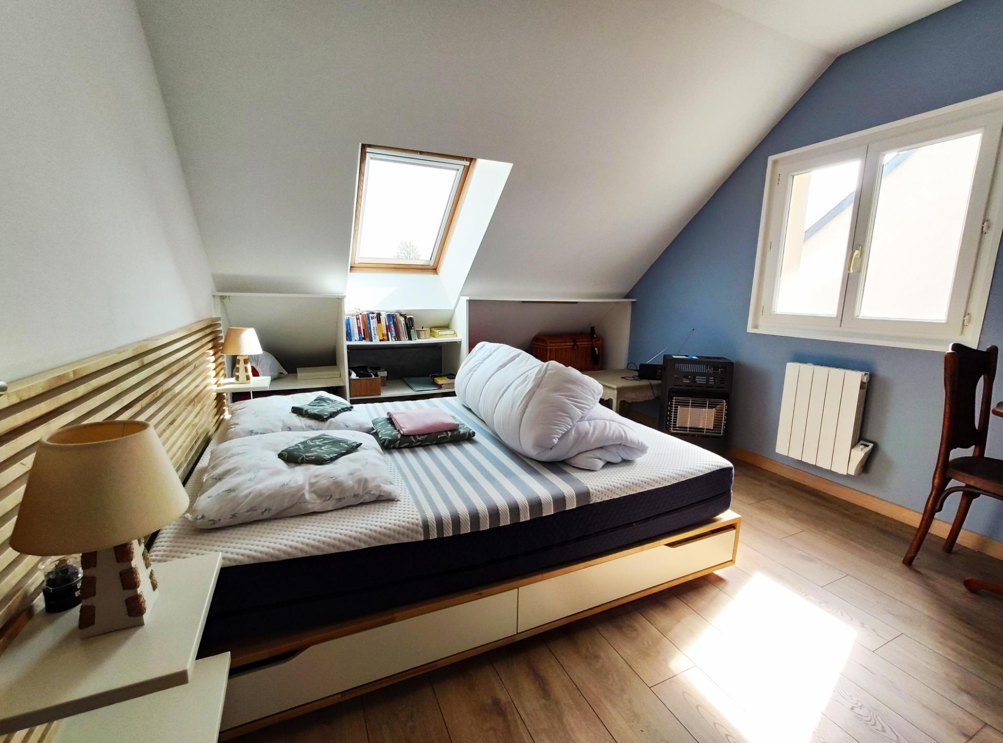 Au rez de chaussée, vous trouverez une pièce de vie d'environ 40m2 avec poêle à bois et cuisine entièrement équipée, 2 chambres dont une avec coin dressing, une salle d'eau, un wc et un garage.