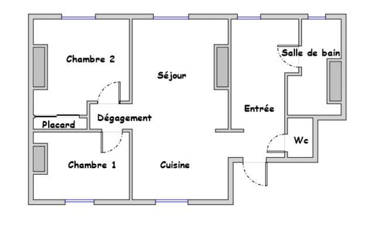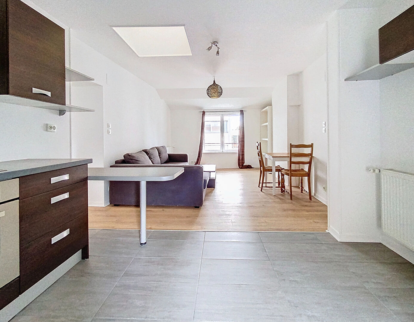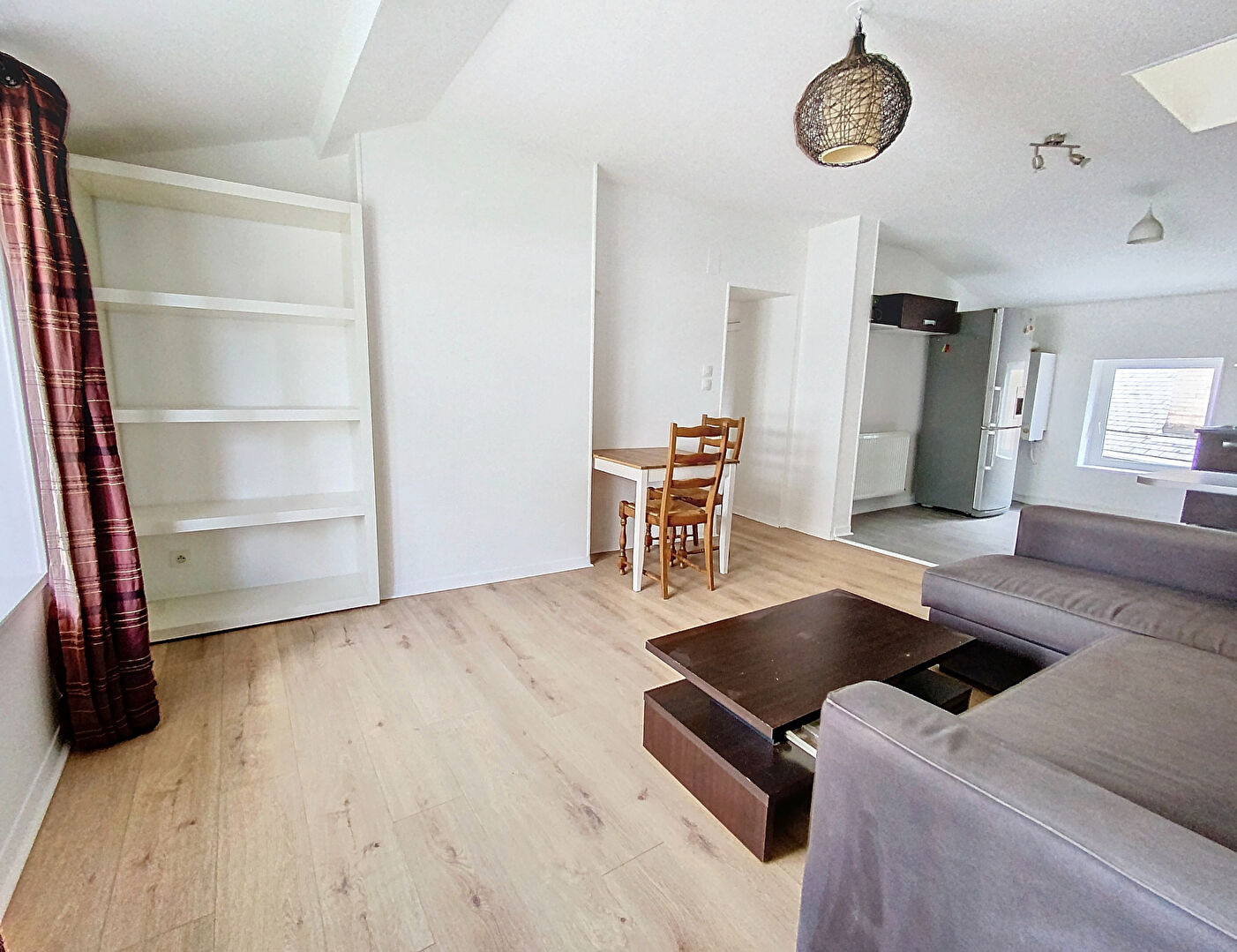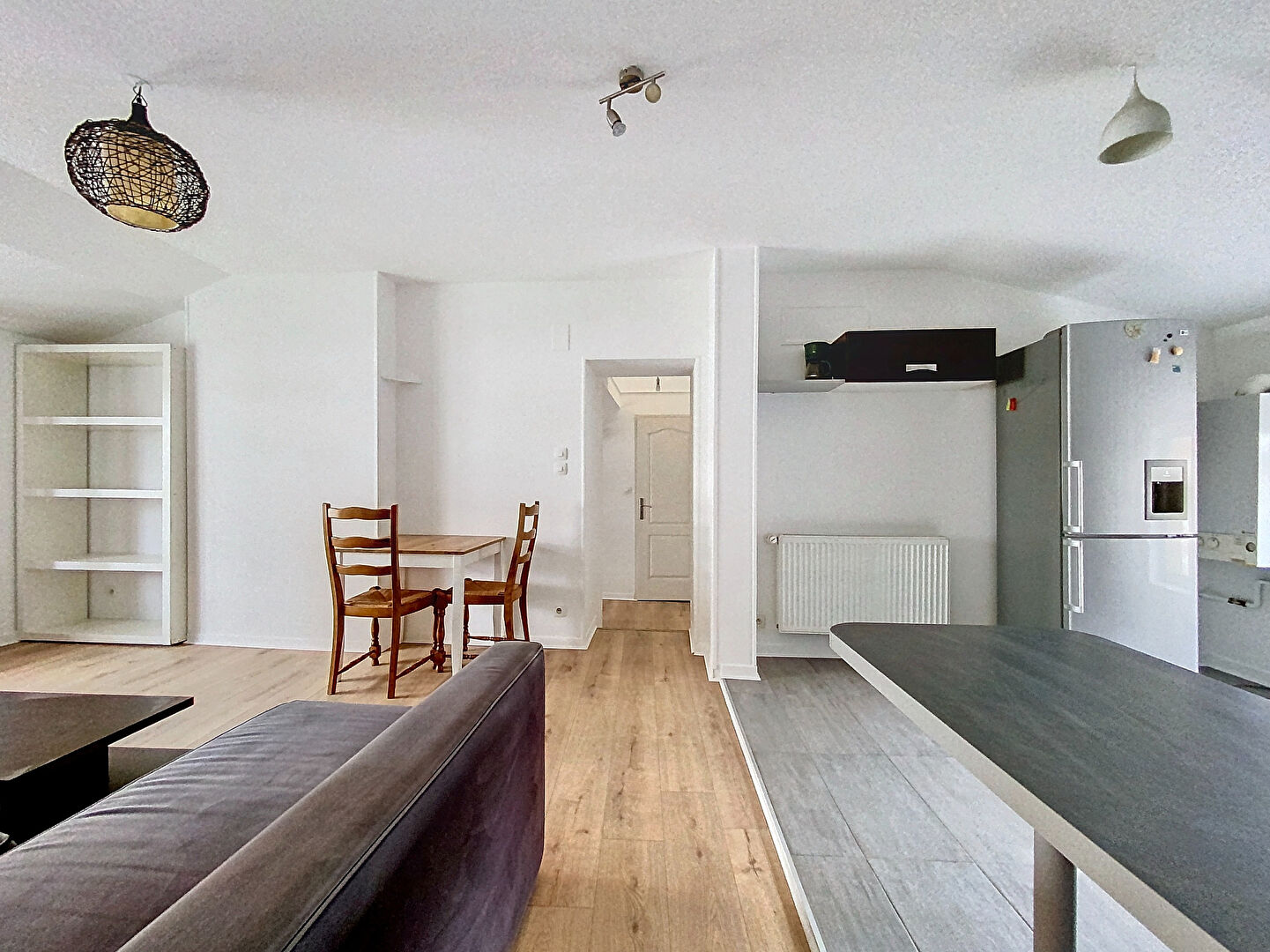 L'appartement comprend une grande entrée, cuisine ouverte sur séjour (26m2), salle d'eau, wc séparés, deux chambres (9,50m2 et 12,60m2)