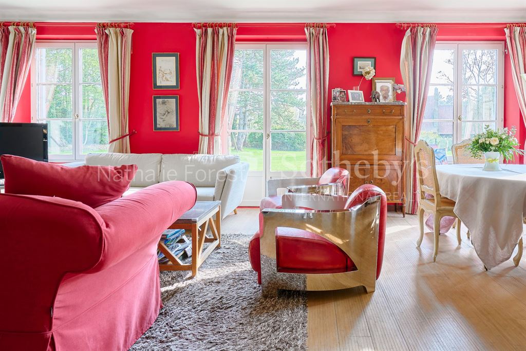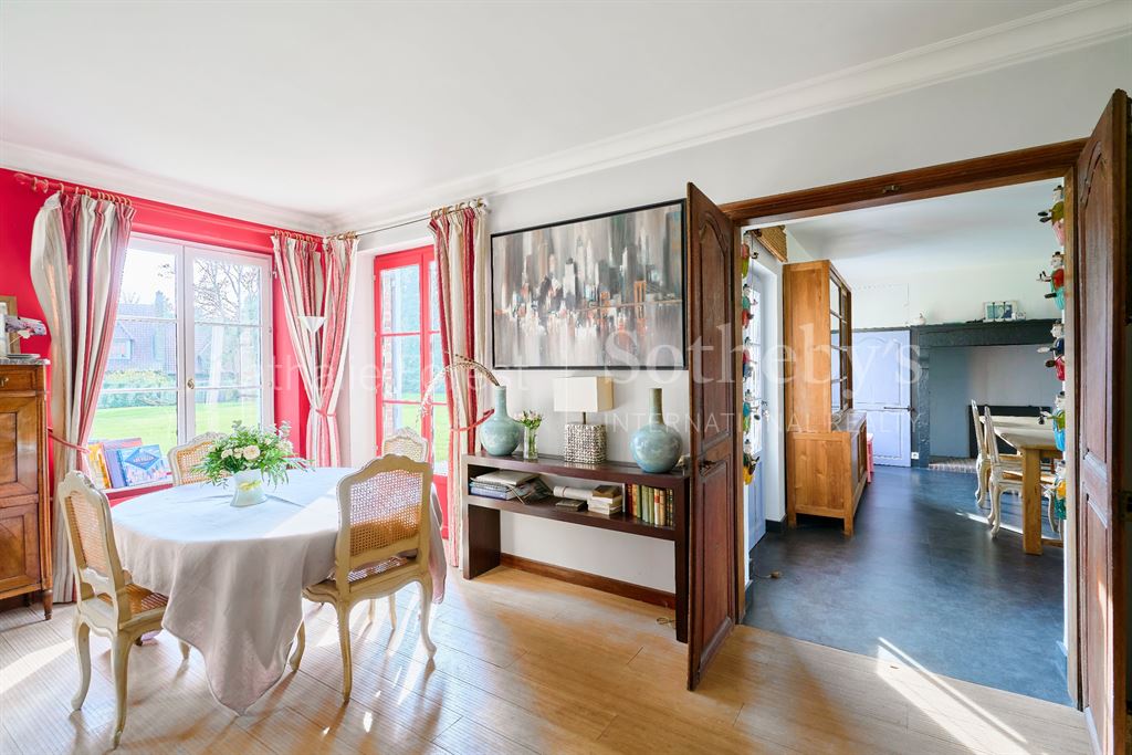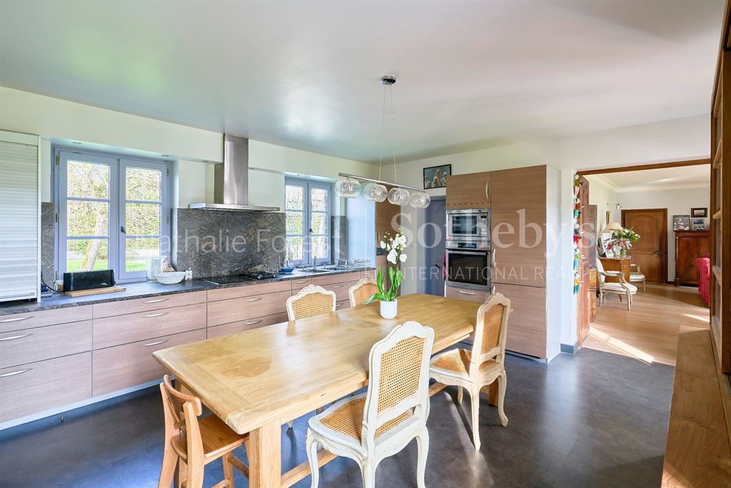 Développée sur deux niveaux, cette demeure de caractère séduit dès l’entrée par un vaste hall avec vestiaire et toilettes invités. Le double séjour de 42 m², agrémenté d’une cheminée à feu de bois, bénéficie d’une luminosité remarquable grâce à ses larges ouvertures sur le jardin exposé plein sud. La cuisine indépendante, entièrement équipée, s’ouvre directement sur une belle terrasse en IP, et se prolonge par une arrière-cuisine fonctionnelle.
