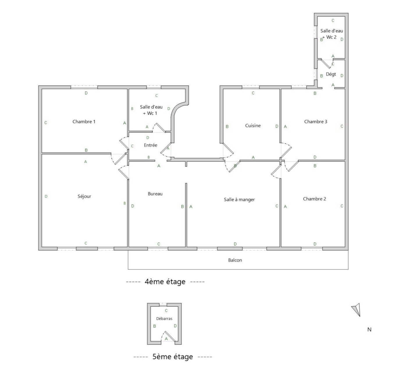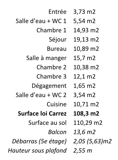 Appartement familial né d’un regroupement de 2 appartements T3, s’étendant seul sur le palier du 4e étage. Surface totale d’environ 110m2. Il se compose d’un salon, une salle à manger, 4 chambres, une cuisine et 2 SDE avec WC. A cela s’ajoute un balcon filant sur rue, 2 caves en sous-sol ainsi qu’une pièce petite mansardée au 5e étage.