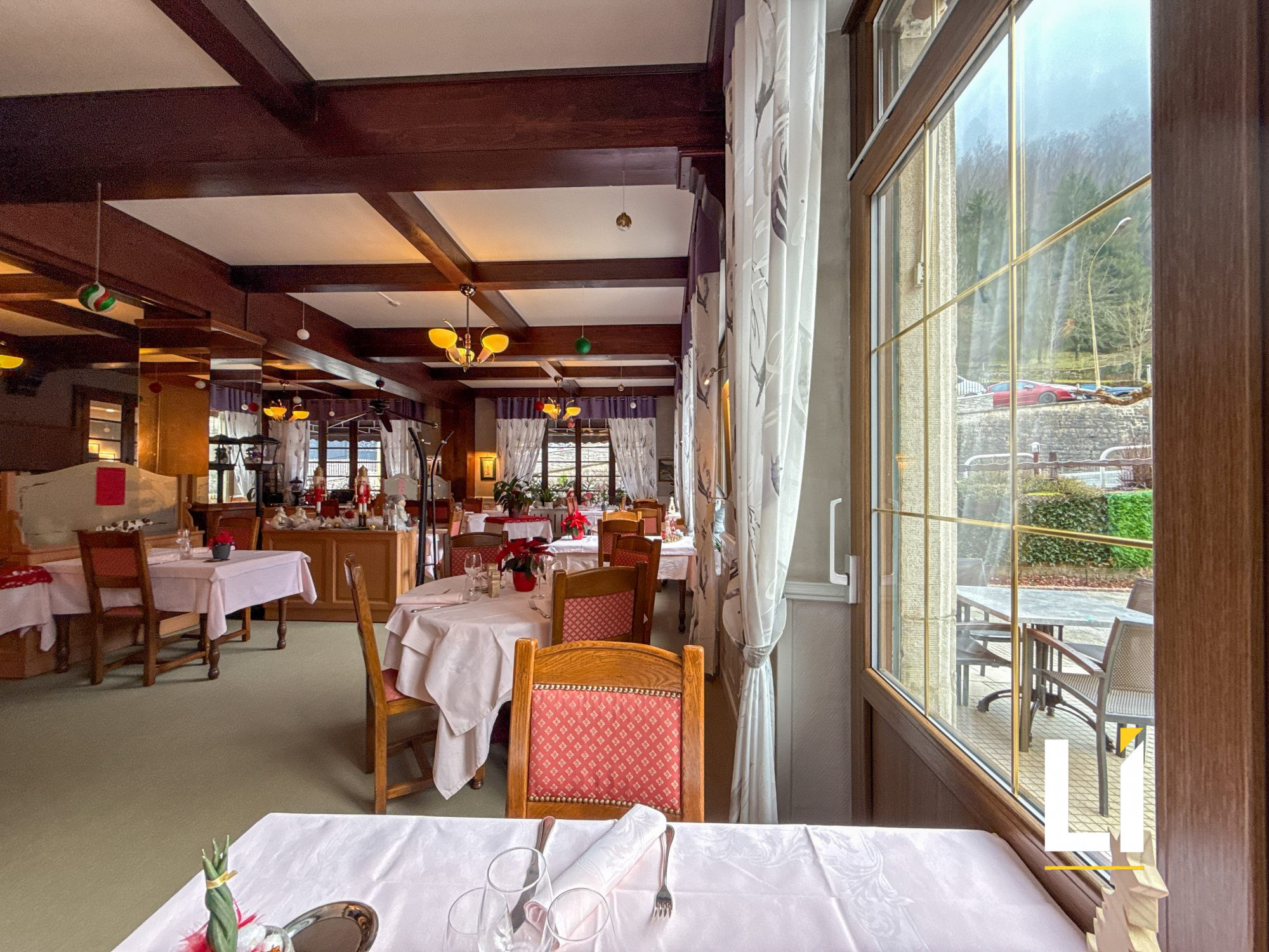 Au rez-de-chaussée, une entrée avec un espace d'accueil mène à une spacieuse salle de restaurant de 116 m² pouvant accueillir environ 80 couverts, ouverte sur une agréable terrasse d'environ 50 couverts, idéale pour développer l'activité durant la belle saison. Ce niveau comprend également un bar ainsi qu'une salle de petits-déjeuners d'environ 12 couverts offrant plusieurs espaces d'exploitation. Les cuisines professionnelles entièrement rénovées il y a une dizaine d'années offrent un espace de travail fonctionnel et bien agencé. Des sanitaires viennent compléter ce niveau.