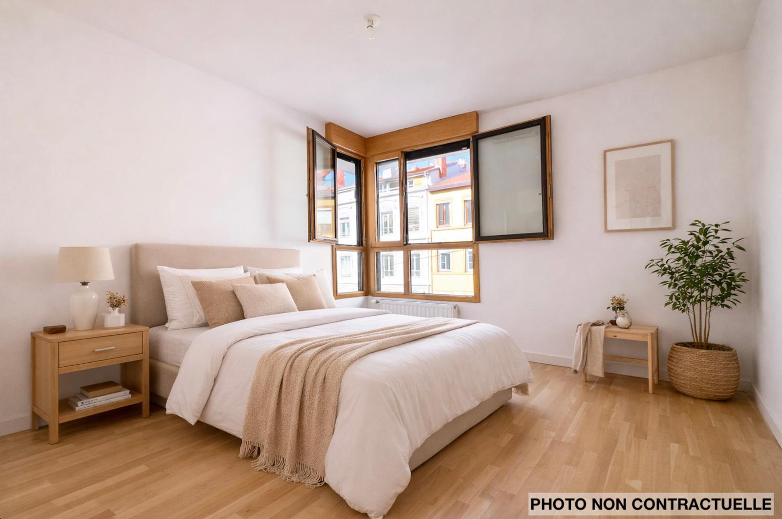 L'espace nuit comprend deux chambres de 12,43 m² et 9,95 m² avec placards muraux. Une salle de bains carrelée de 3,53 m² (meuble vasque et sèche-serviettes), un WC suspendu séparé, une buanderie et des rangements complètent un agencement fonctionnel et harmonieux.