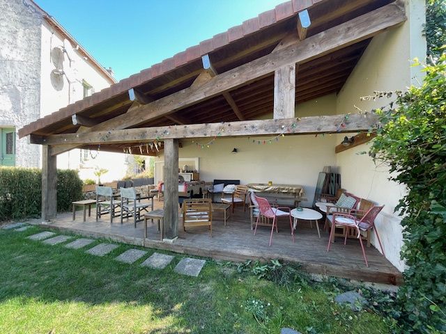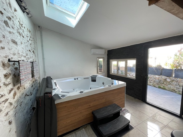 Dépendances : appentis avec terrasse, pièce détente avec jacuzzi et douche, cave, appentis.