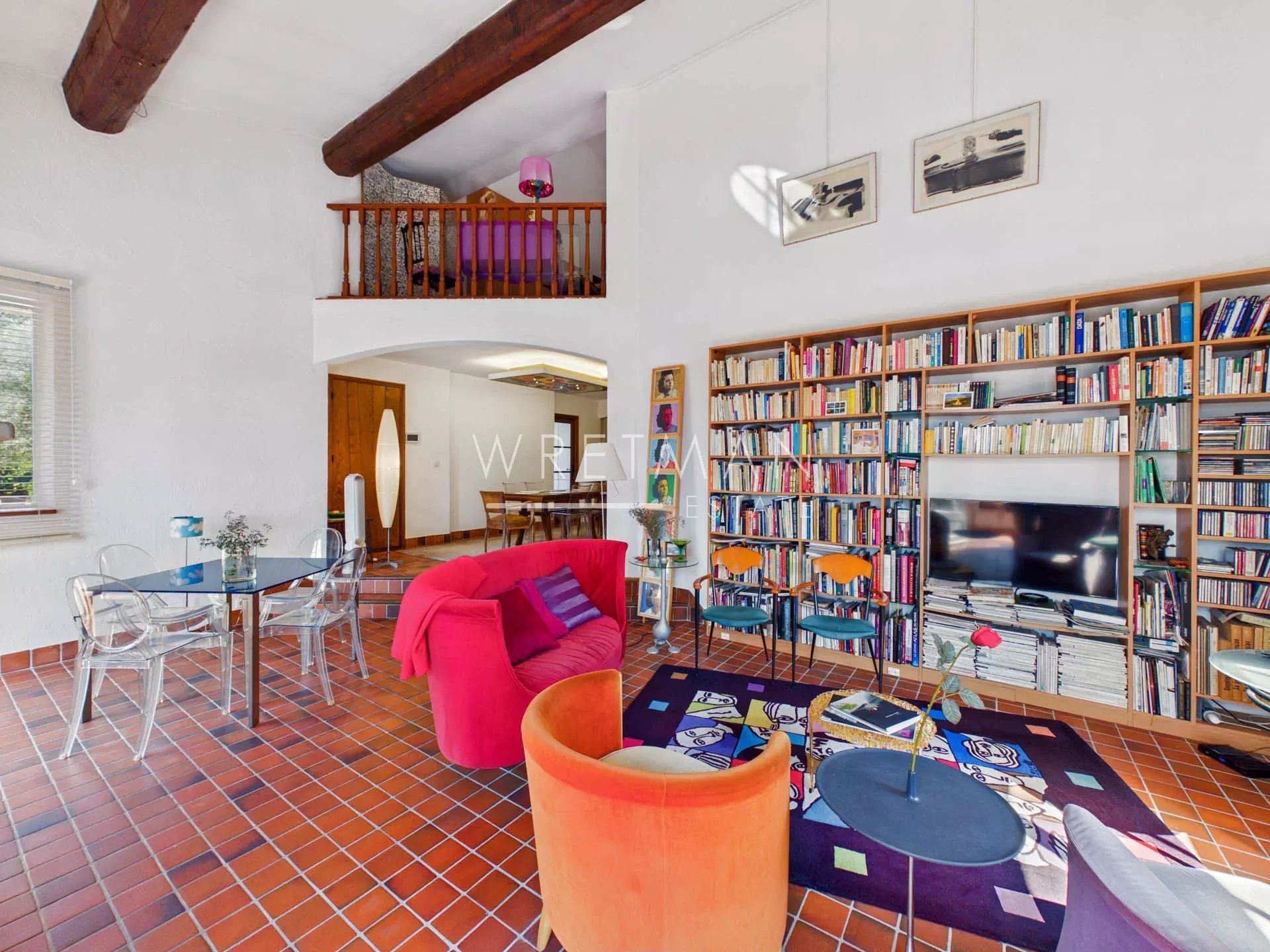 Le rez-de-chaussée vous offre un vaste et lumineux séjour de 50 m² avec plafond cathédrale, cheminée et espace salle à manger, donnant sur une grande terrasse. Vous trouverez également une cuisine équipée avec accès à la terrasse, ainsi qu'une chambre avec salle de bain et dressing.