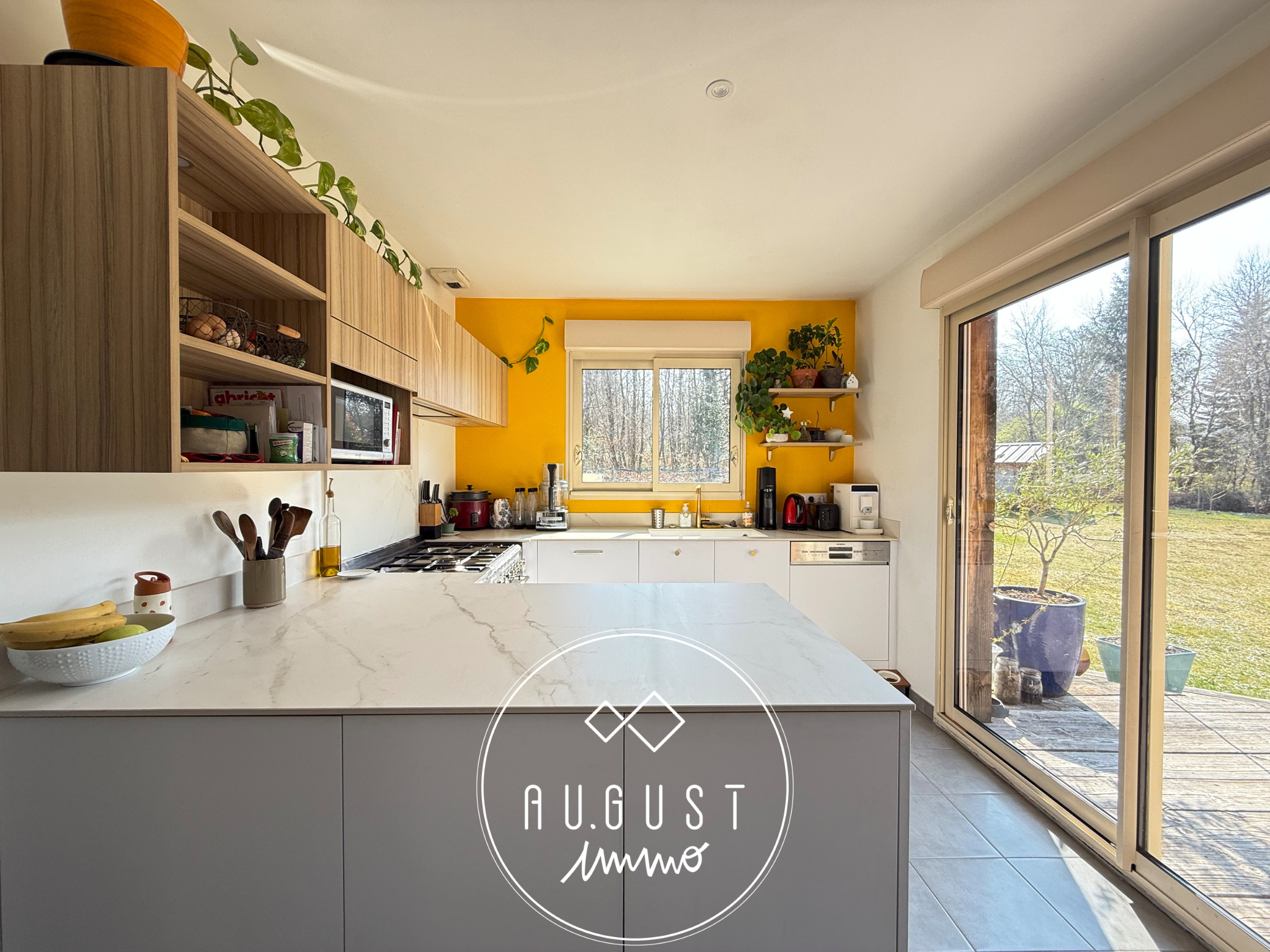 EXCLUSIVITE COGNAC LA FORET : AUGUST vous invite à venir découvrir cette charmante maison à ossature bois de 121 m2, édifiée en 2011, sur une belle parcelle de terrain de plus de 2200 m2 entièrement clôturée, offrant un cadre de vie calme et verdoyant sans aucune nuisance.