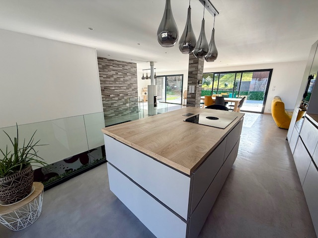 À l'étage, profitez d'un superbe espace de vie baigné de lumière, comprenant une grande pièce de vie conviviale avec une cuisine ultra moderne entièrement équipée ainsi que d'une belle terrasse avec une piscine chauffée et un espace pool house sans vis-à-vis.