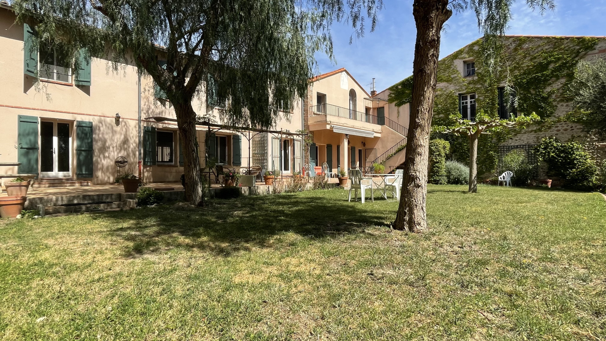 L'habitation principale se compose d'un vaste salon-séjour traversant de plus de 67 m2, baigné de lumière, ouvert d'un côté sur le jardin , avec accès à une agréable terrasse ombragée et de l'autre sur une cour extérieure.