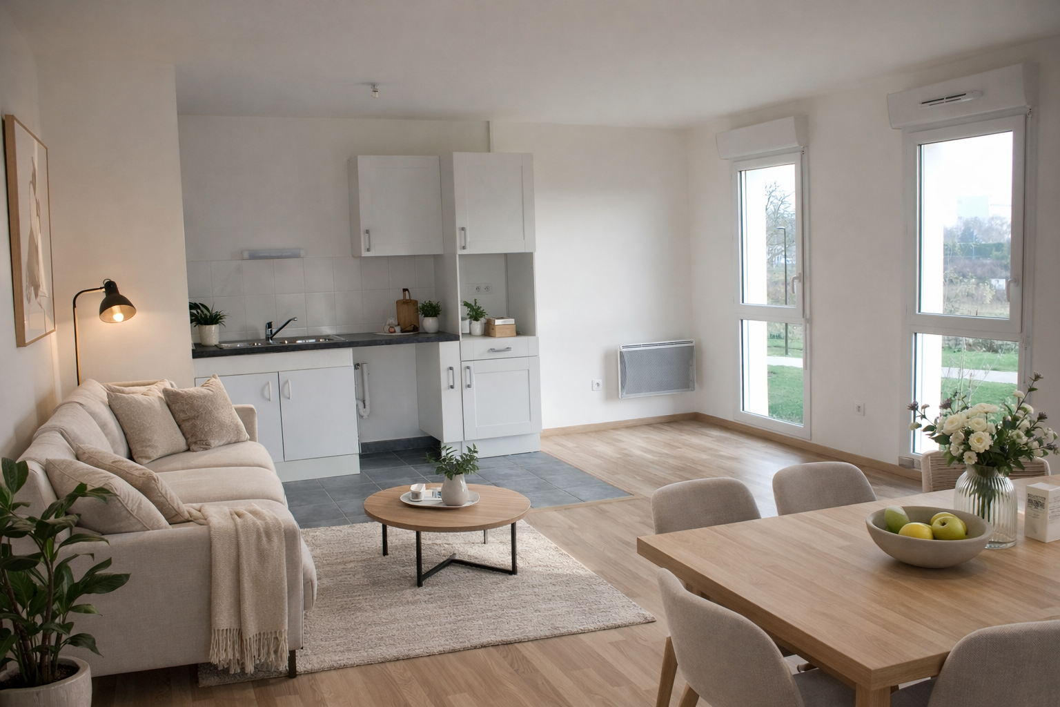 L'appartement se compose d'une entrée, un agréable et spacieux séjour de 30m2 avec cuisine ouverte, 2 chambres, salle de bains et wc le tout avec sur un balcon orienté plein sud.