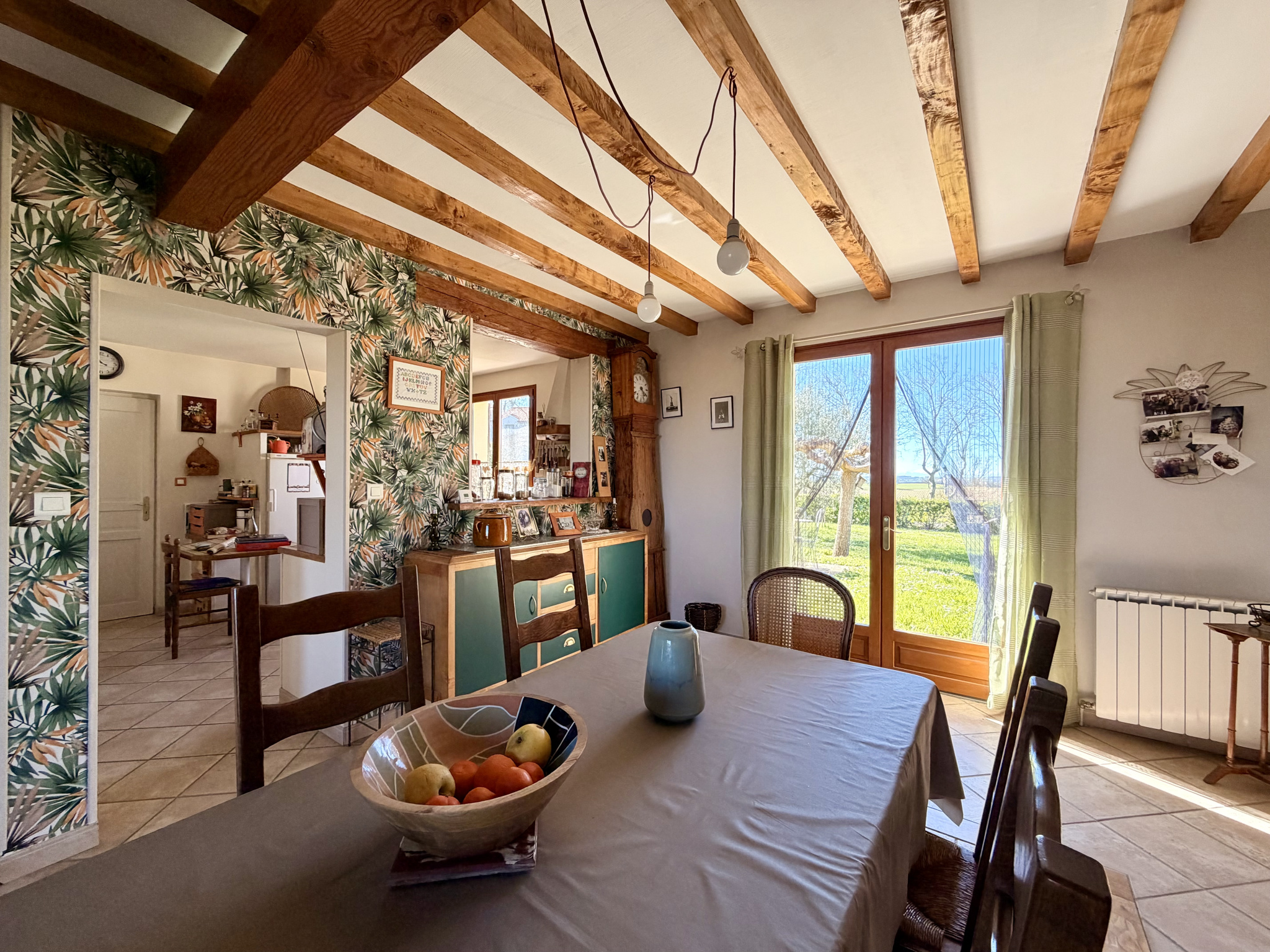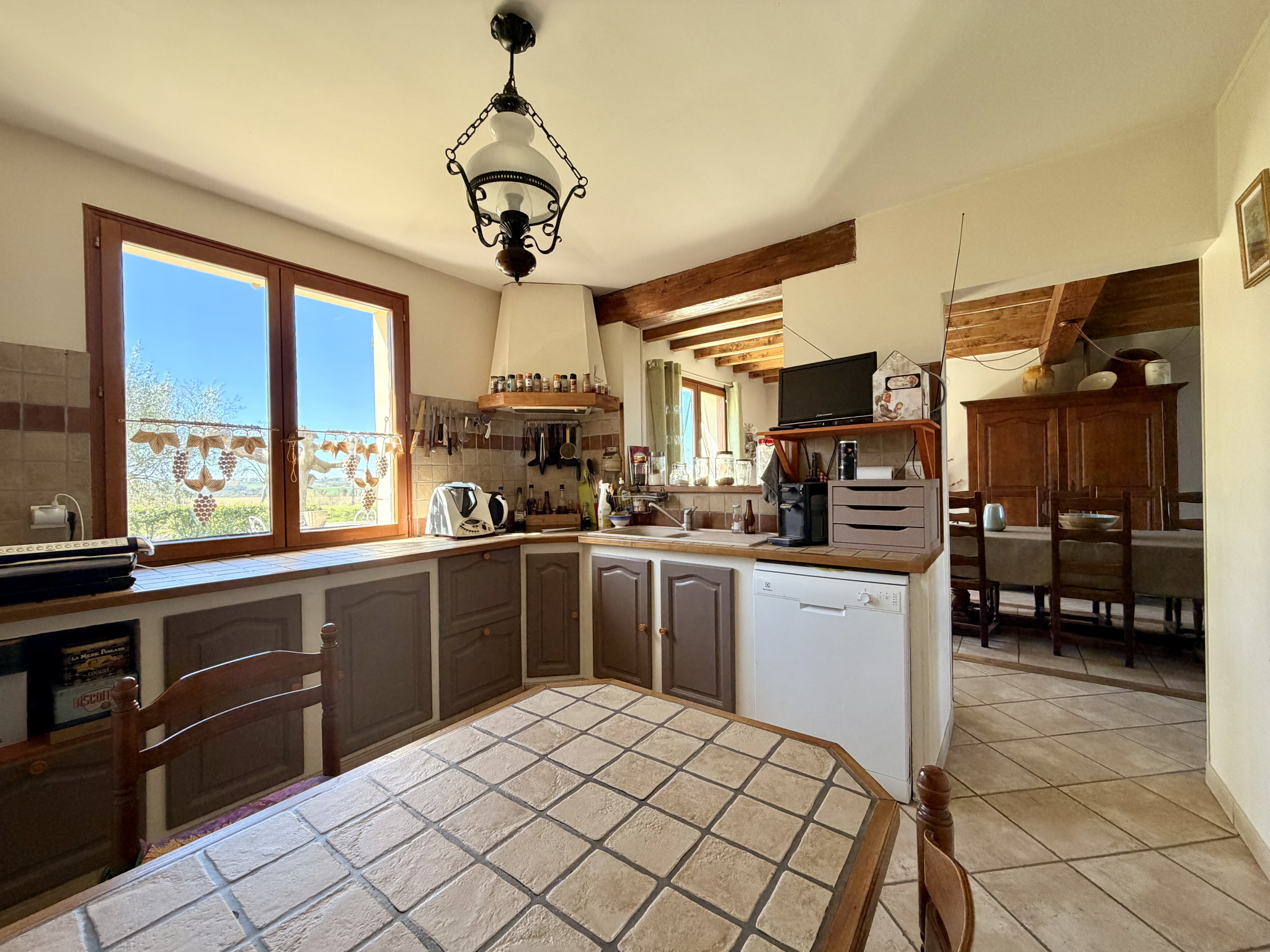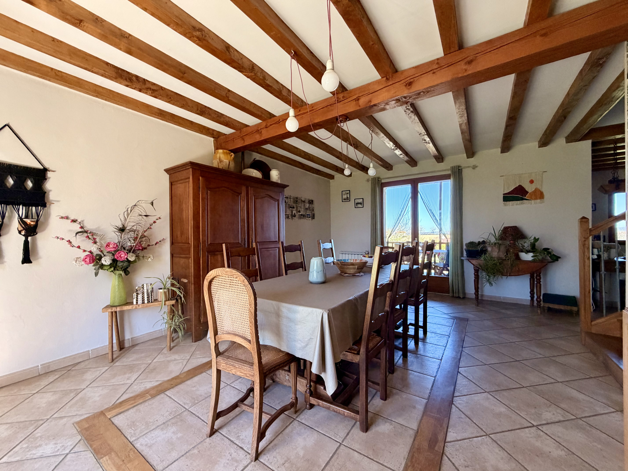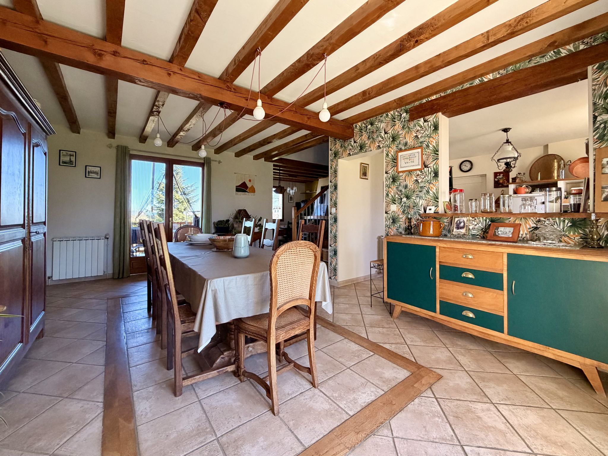 A gauche, la cuisine ouverte sur la lumineuse salle à manger donnant accés aux terrasses dont une plein sud avec vue sur les pyrénées, et le salon avec insert idéal pour un moment de détente au coin du feu.