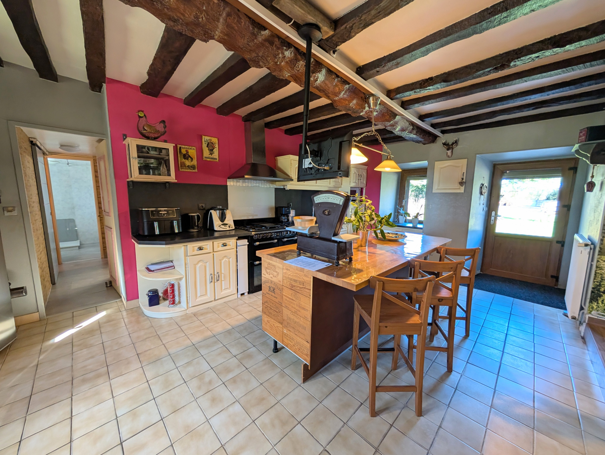 La maison offre une rénovation alliant confort et authenticité. Le rez-de-chaussée est composé d'une vaste véranda conviviale avec son barbecue et son four à pain et très lumineuse grâce aux verrières, d'une pièce de vie conviviale comprenant une cuisine aménagée et équipée ouverte sur un salon-séjour agrémenté d'un poêle à bois performant. On y trouve également une buanderie fonctionnelle, une salle d'eau rénovée et un WC. L'étage dispose d'une grande mezzanine pouvant être aménagée en cinquième chambre, idéale pour un espace bureau ou bibliothèque, mais également quatre chambres confortables, un WC et une salle de bains privative.