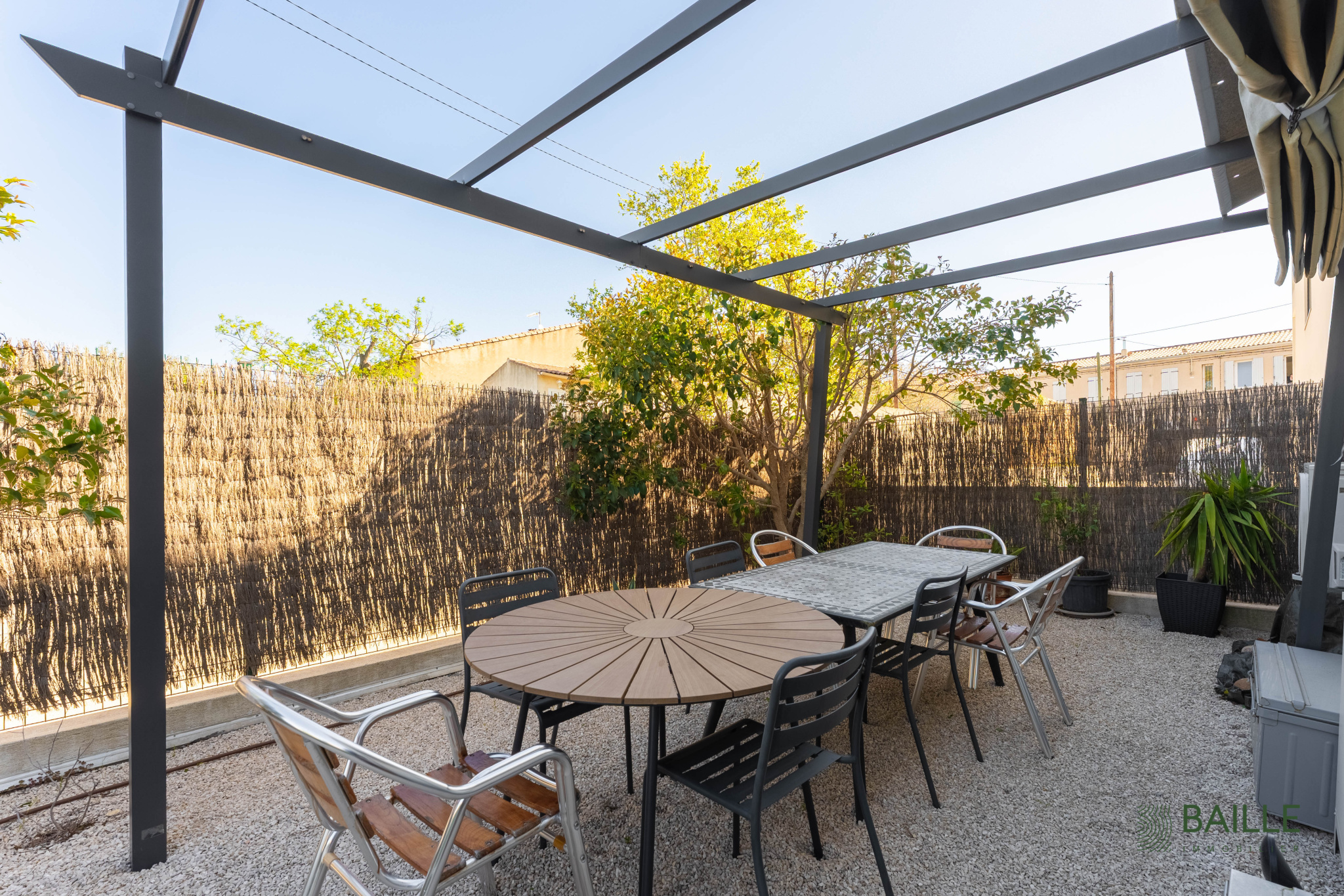 L'extérieur est composé d'un jardin, une terrasse et un espace pergola pour déjeuner à l'abri du soleil.