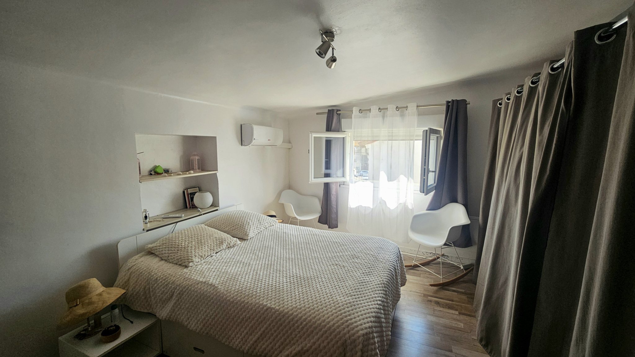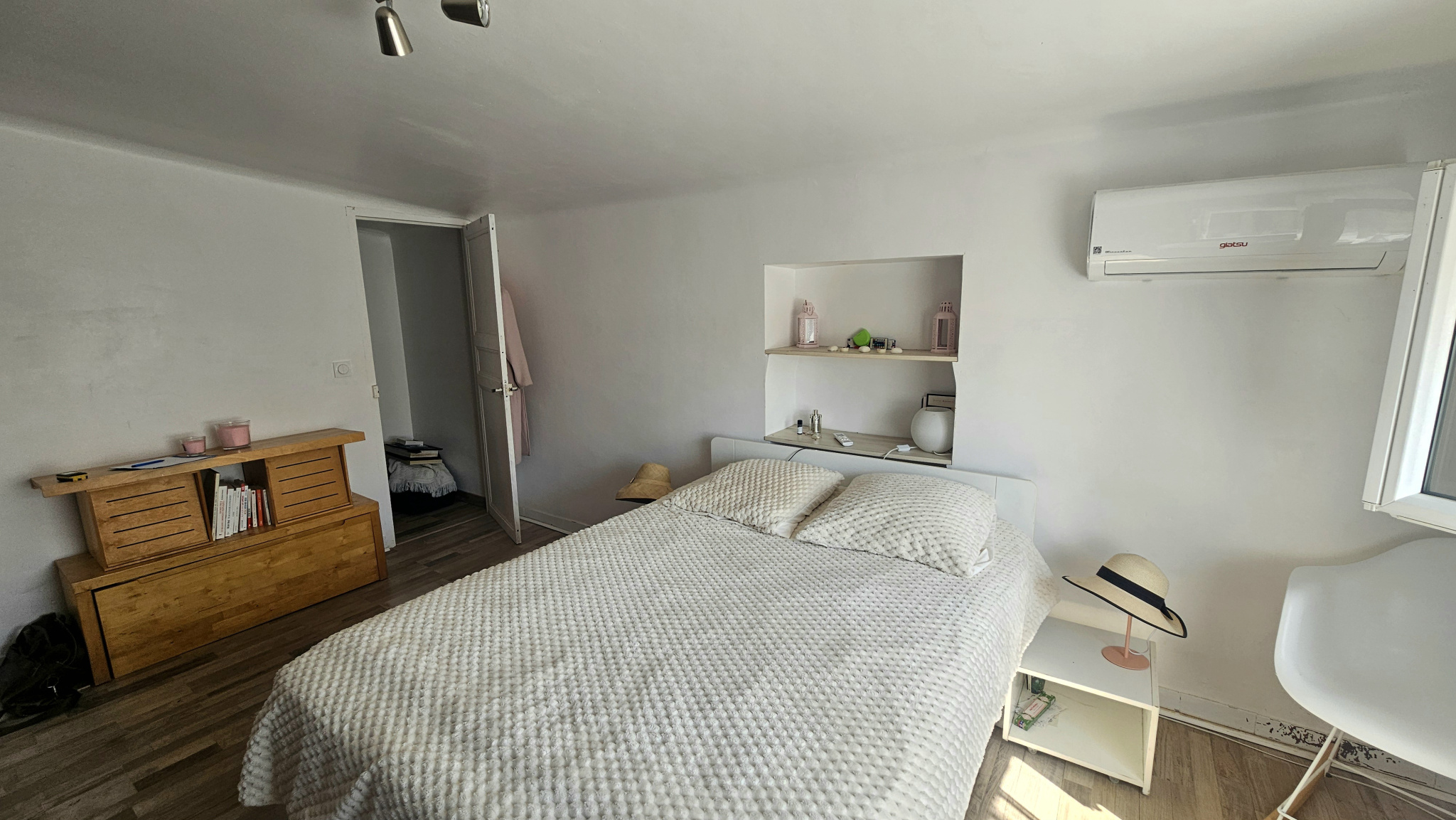 Au rez-de-chaussée, découvrez un salon-séjour lumineux avec cuisine ouverte, idéal pour recevoir famille et amis. La pièce est équipée d'une climatisation réversible pour un confort optimal toute l'année. À l'étage, un dégagement dessert une salle d'eau entièrement refaite et une chambre pouvant également servir d'espace bureau selon vos besoins. Le deuxième étage offre une grande chambre avec un coin dressing et une seconde climatisation réversible, parfaite pour créer un espace nuit spacieux et confortable.