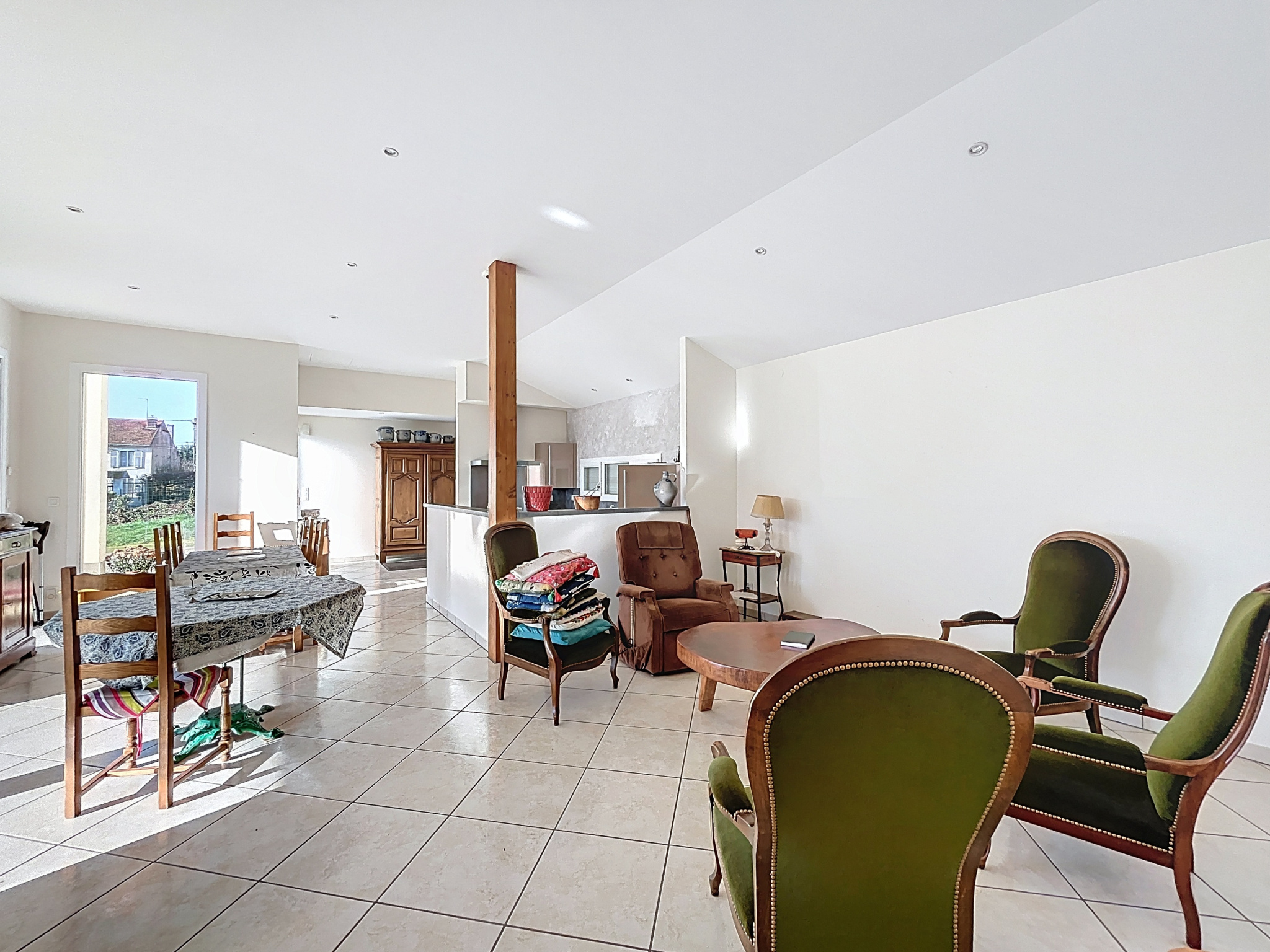 - Cuisine équipée ouverte sur séjour et salon (48,50 m2) : sol carrelage, éléments de rangement hauts et bas, évier, lave-vaisselle, hotte, plaque induction, réfrigérateur, espace repas, 2 baies vitrés fixe + 2 portes donnant accès à la terrasse et le jardin.