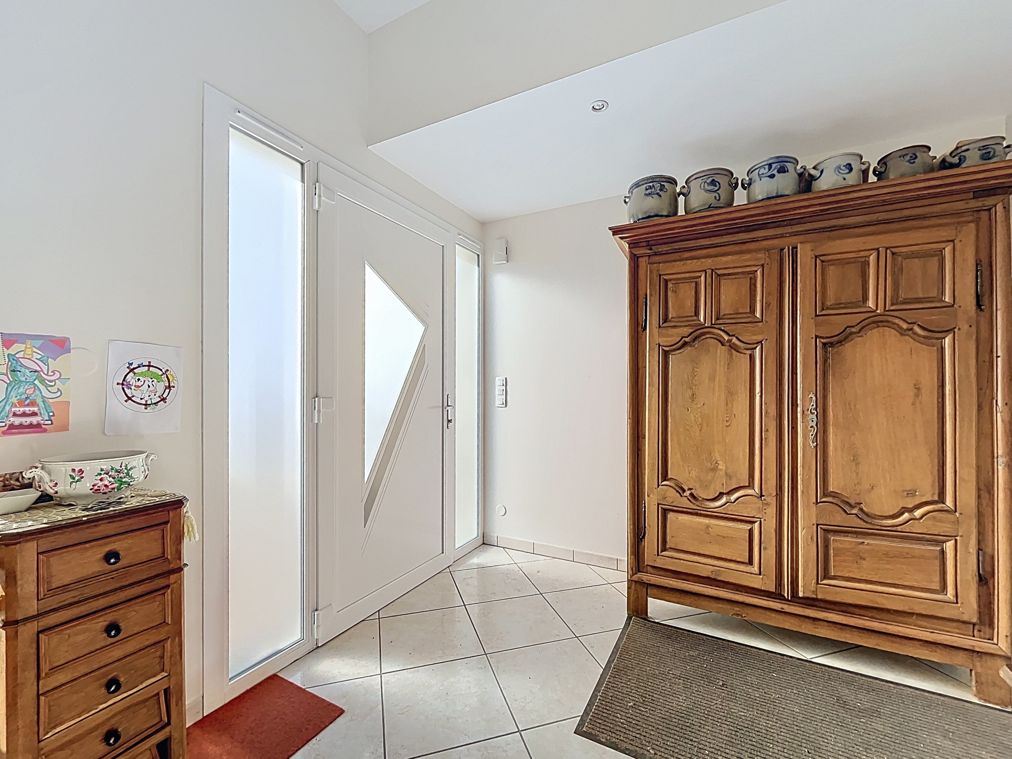 - Entrée/dégagement (11,75 m2) : sol carrelage, porte d'entrée PVC