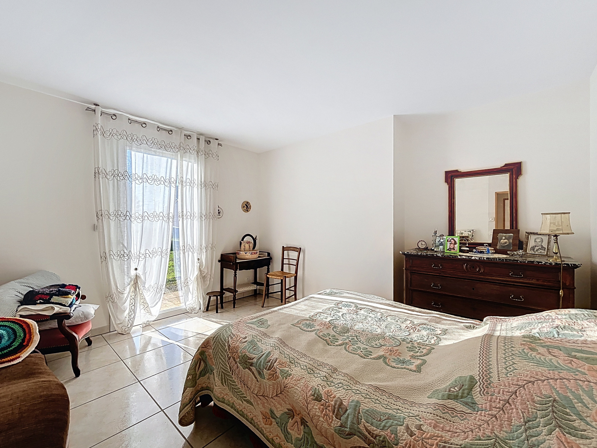 - Chambre 1 (13,85 m2) : sol carrelage, 1 porte fenêtre.