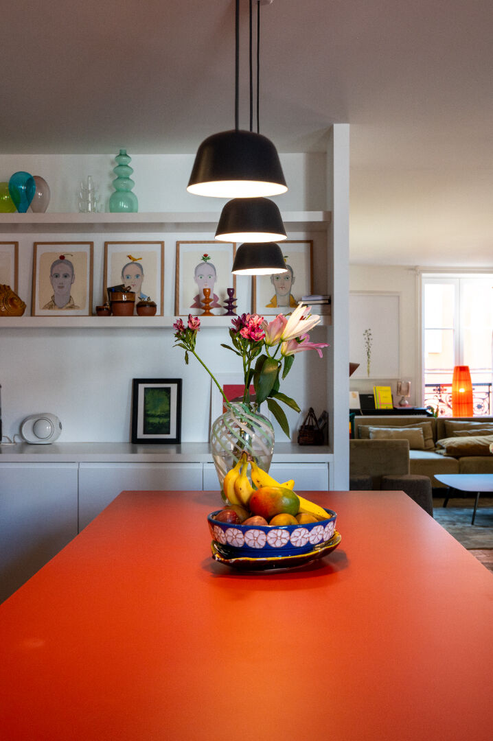 Le salon est sublimé par une grande bibliothèque intégrée et de nombreux rangements.