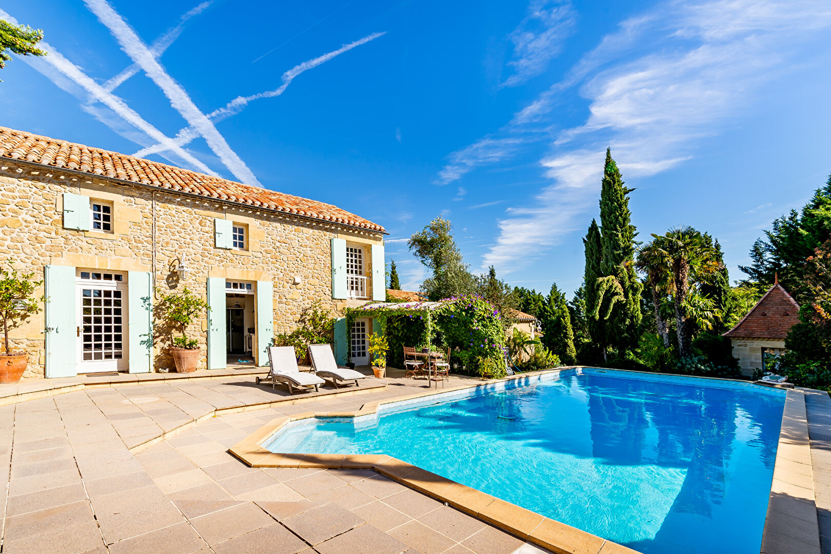 À seulement 15 minutes de Saint-Émilion, découvrez cette propriété de charme nichée sur une colline, offrant des vues remarquables. L'authenticité de la bâtisse s'harmonise parfaitement avec un parc paysager où règnent calme et intimité. La demeure vous accueille par un superbe jardin japonais, véritable invitation à la sérénité. La piscine, entourée de plantes et d'arbres somptueux, met en valeur une grande diversité d'essences soigneusement entretenues. Une terrasse ombragée ainsi qu'un pigeonnier viennent compléter les espaces extérieurs, répartis sur environ 9 000 m² de terrain.