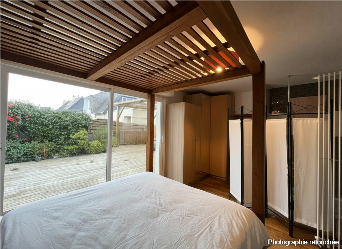 A l'extérieur, vous profiterez de moments de détente avec sa pergola et sa terrasse bois intimiste.