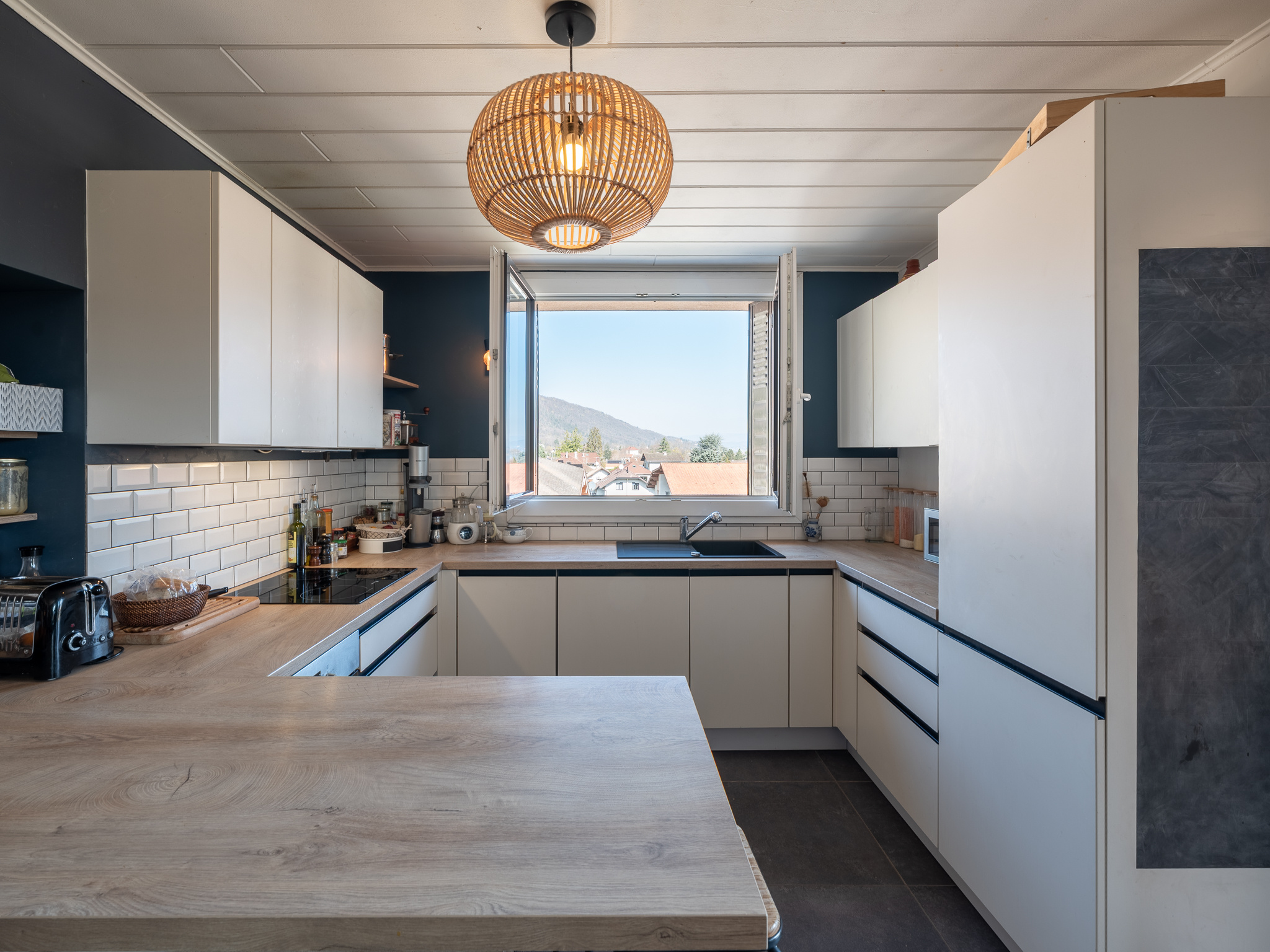Dès l'entrée, vous accédez à une spacieuse pièce de vie baignée de lumière, ouverte sur un balcon de 12 m2 permettant de profiter d'une vue panoramique sur le lac et les montagnes. La cuisine ouverte, conviviale et fonctionnelle, bénéficie également d'un accès à une véranda de 5,60 m2 exposée Nord-Est, idéale pour un espace repas ou un coin détente.