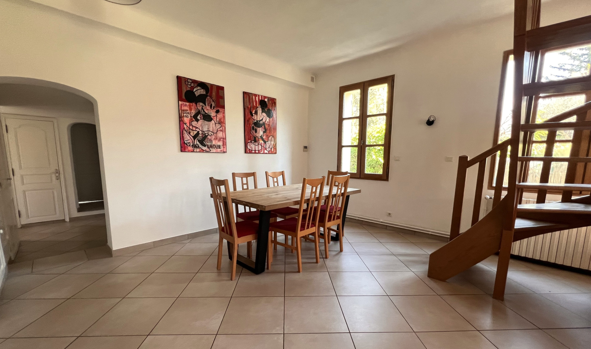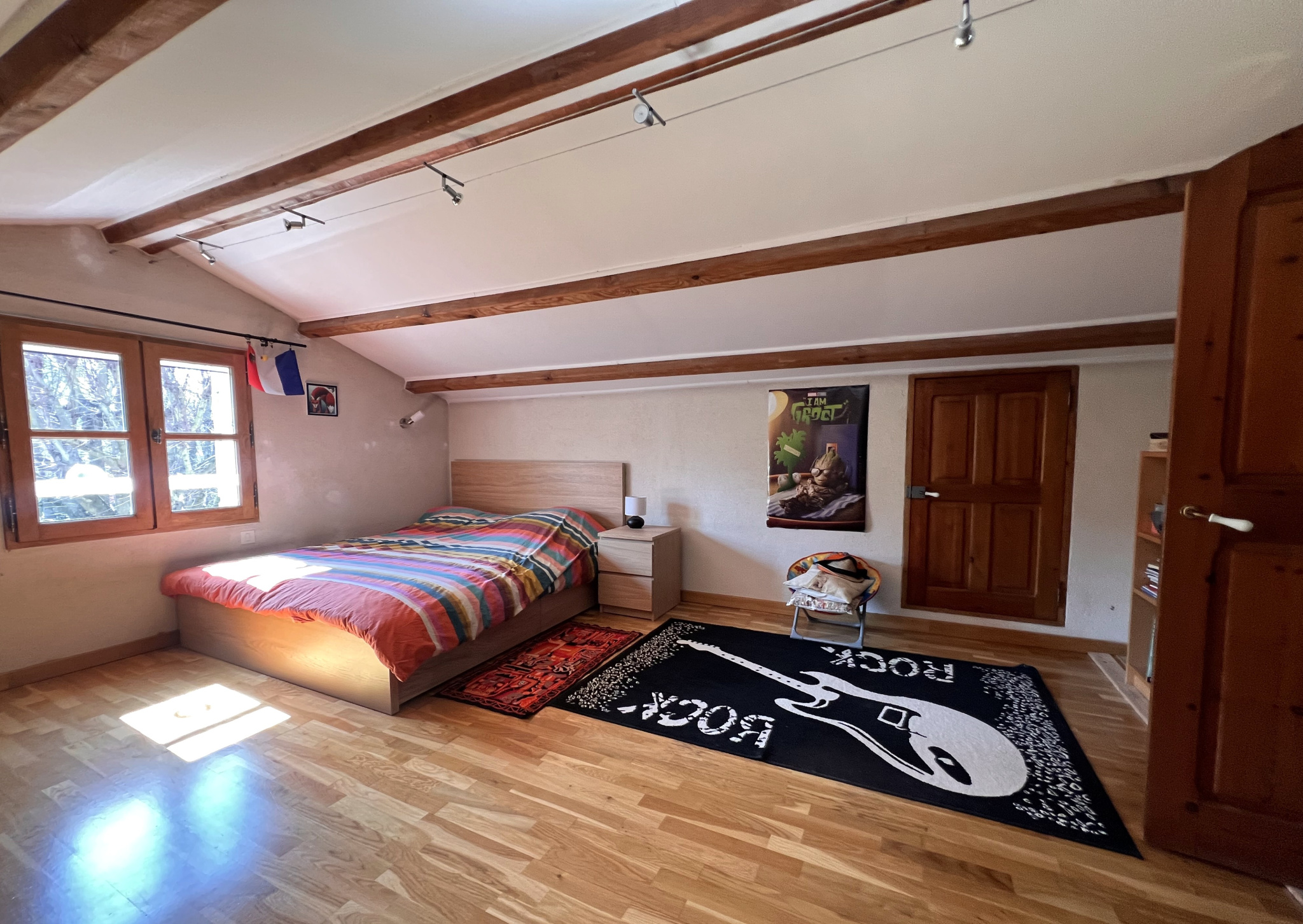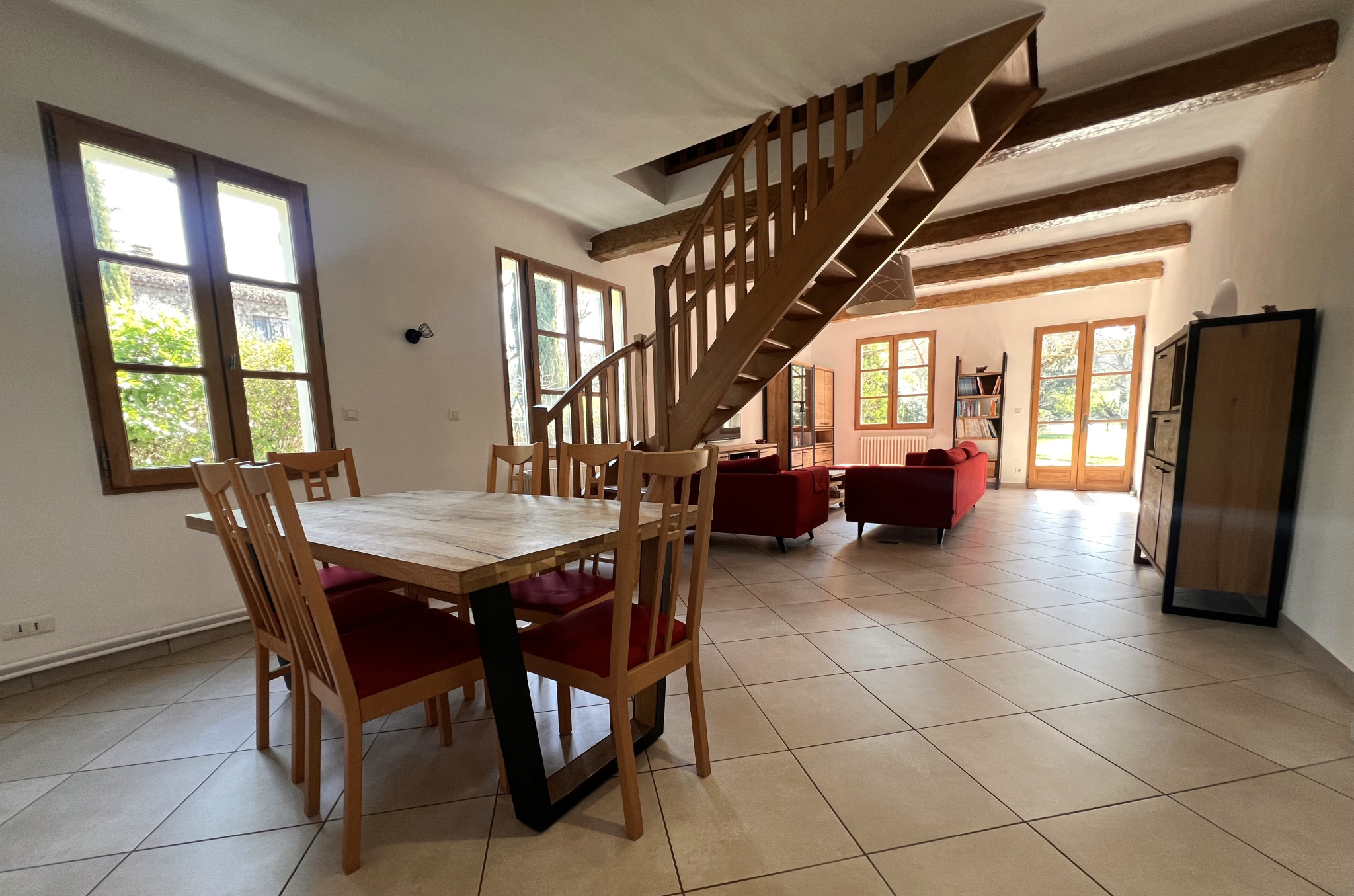 Au rez de chaussée, vous trouverez une pièce de vie de presque 50 m2 divisée en salle à manger et séjour puis une cuisine séparée mais ouverte, trois chambres, un bureau , une salle de bains et une salle d'eau. À l'étage deux grandes chambres sous pente.