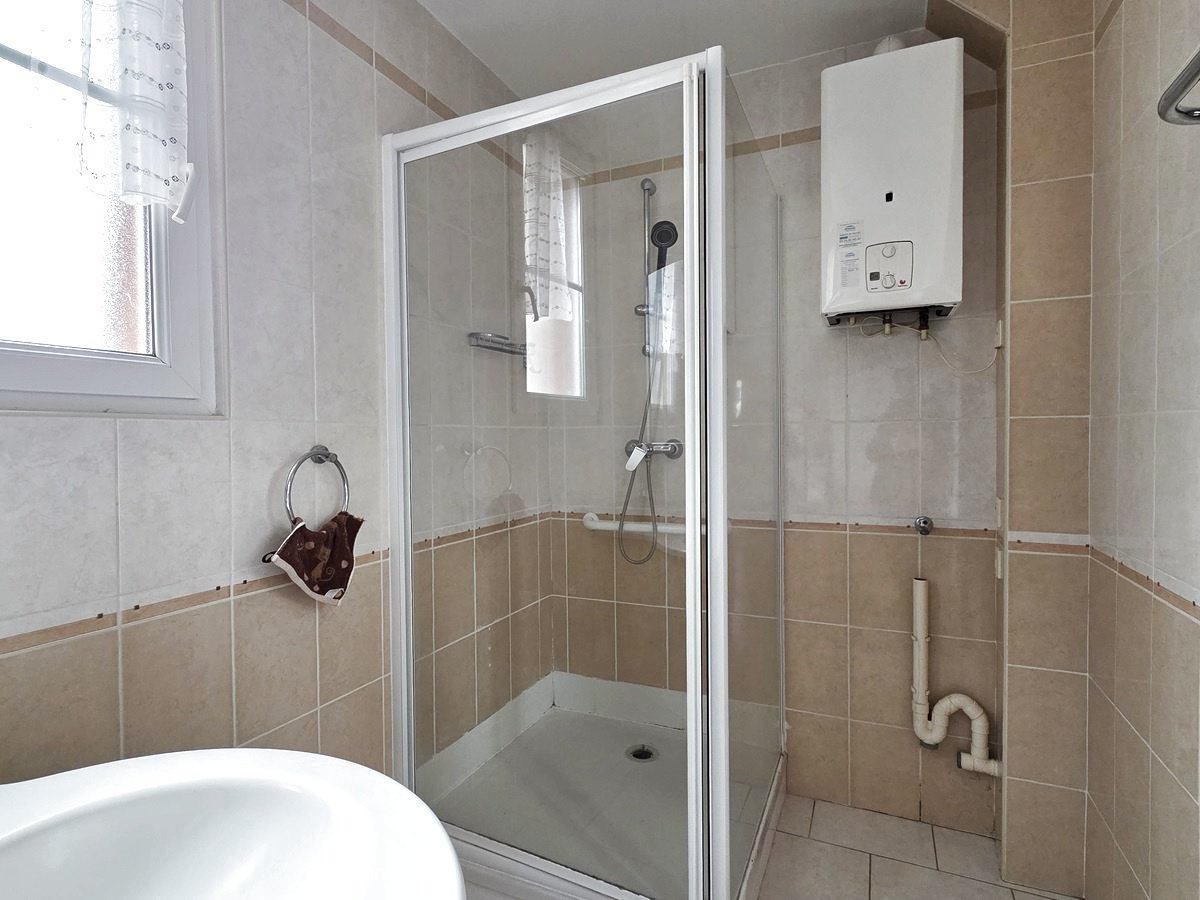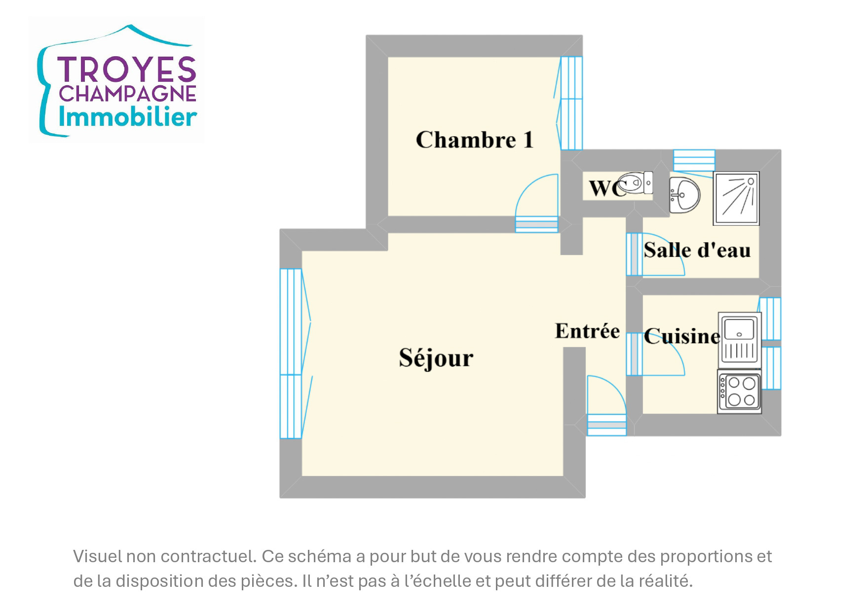 Entrée, séjour, cuisine aménagée et équipée, une chambre, une salle d'eau et un wc séparé.