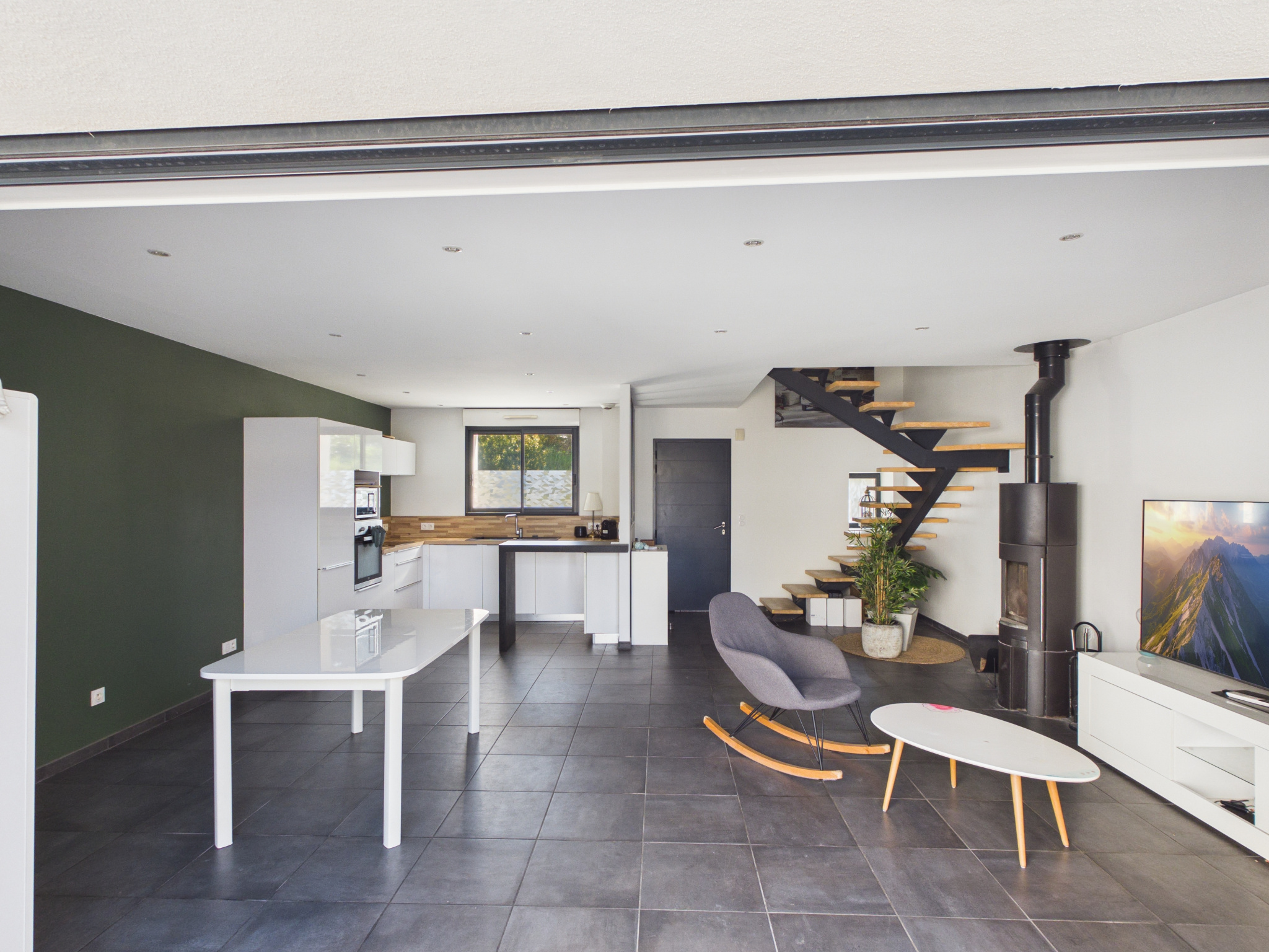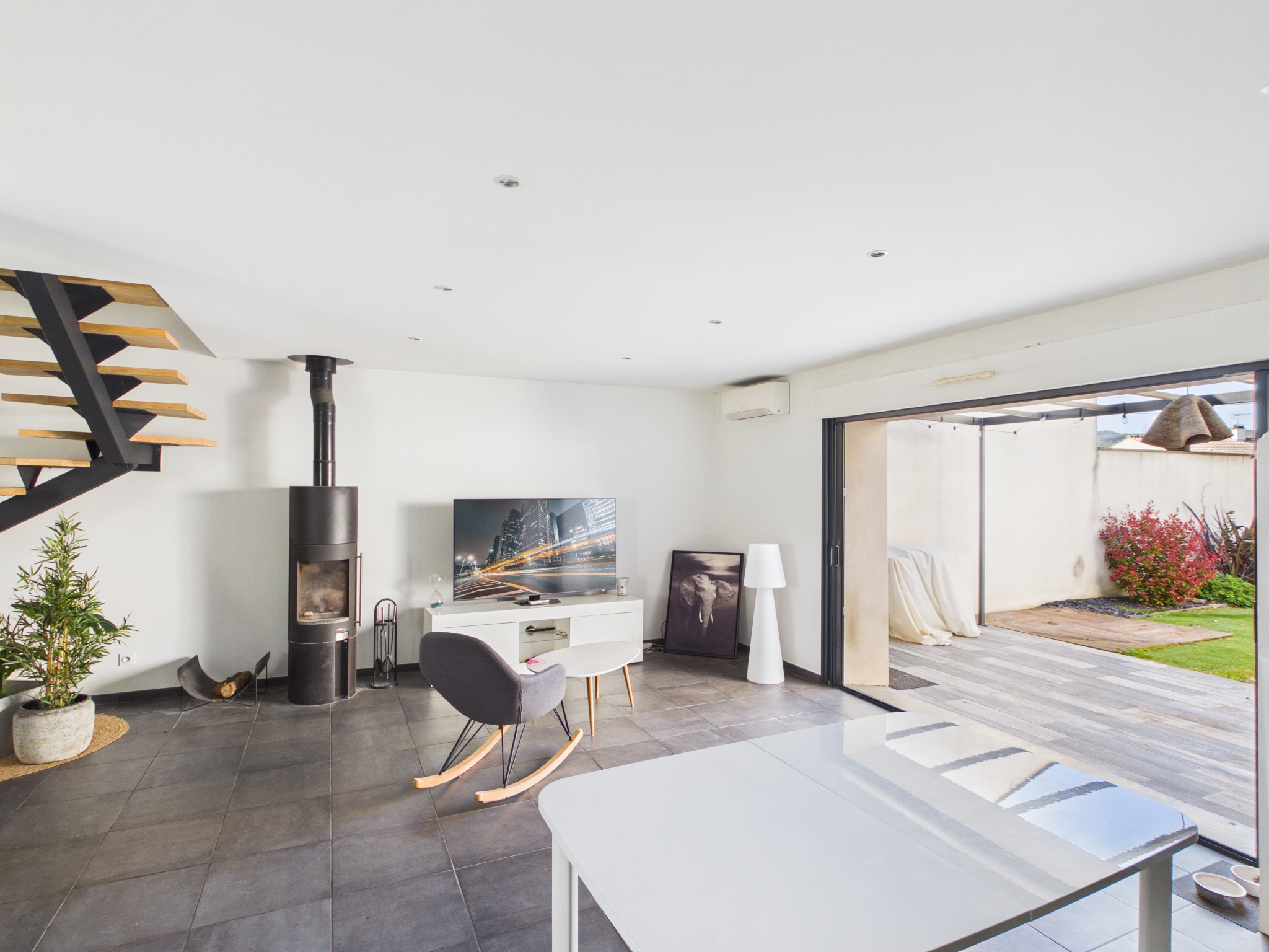 Au rez-de-chaussée, vous découvrirez une belle pièce de vie conviviale composée d'une cuisine aménagée et équipée ouverte sur le séjour/salon, agrémenté d'un poêle à bois. Cet espace lumineux offre un accès direct à la terrasse, à la pergola et au jardin.