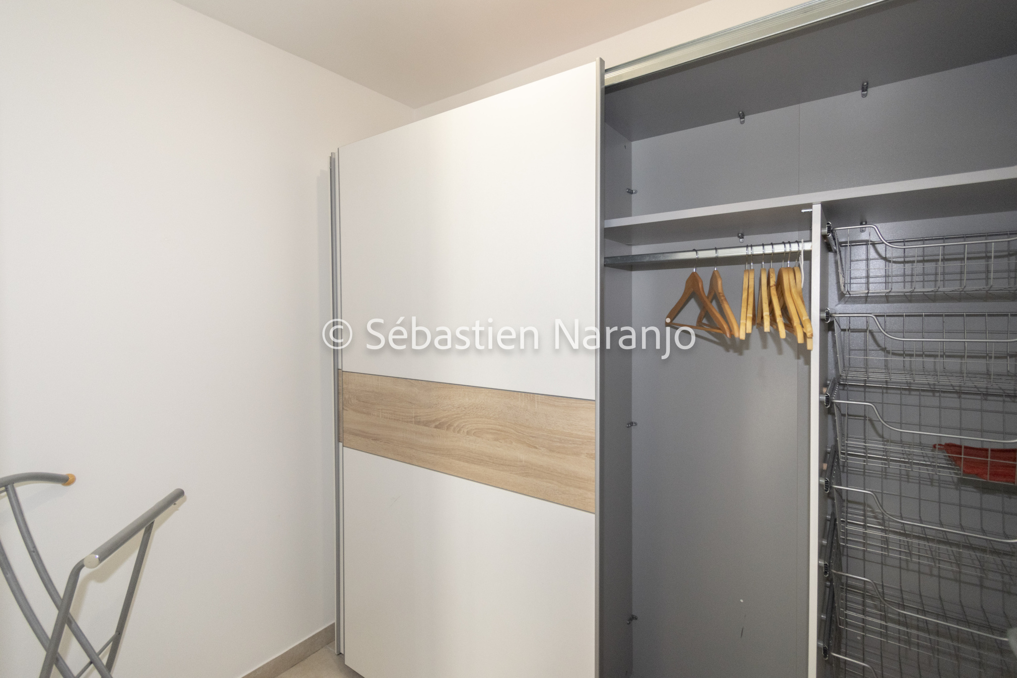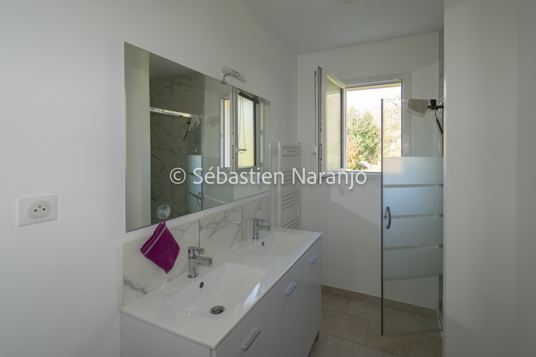 Elle se compose de trois chambres, dont une suite parentale avec salle d'eau, WC et dressing, d'une seconde salle d'eau avec douche à l'italienne, d'un WC indépendant ainsi que d'une pièce de vie lumineuse avec cuisine ouverte et entièrement équipée, un garage et un cellier.