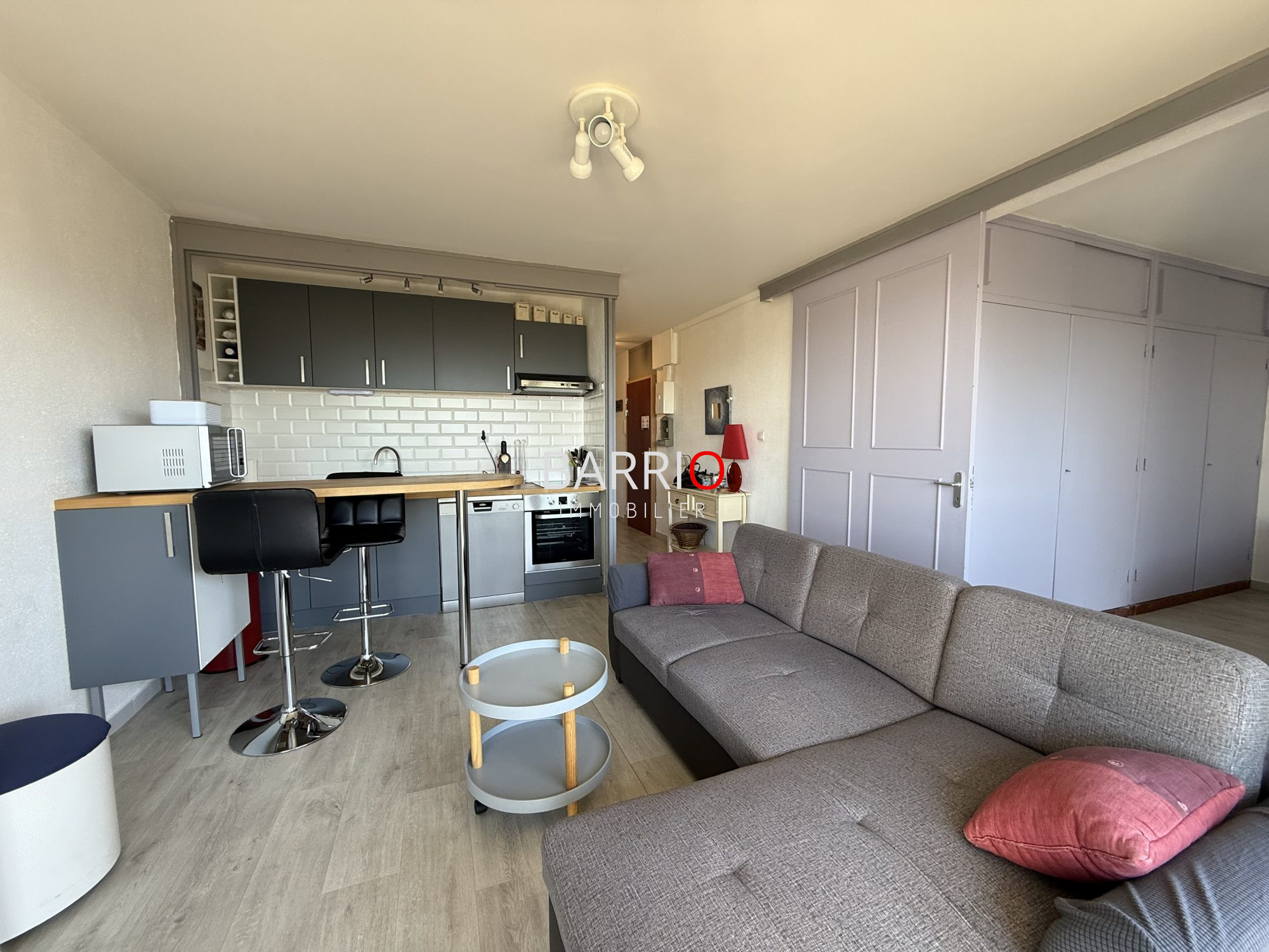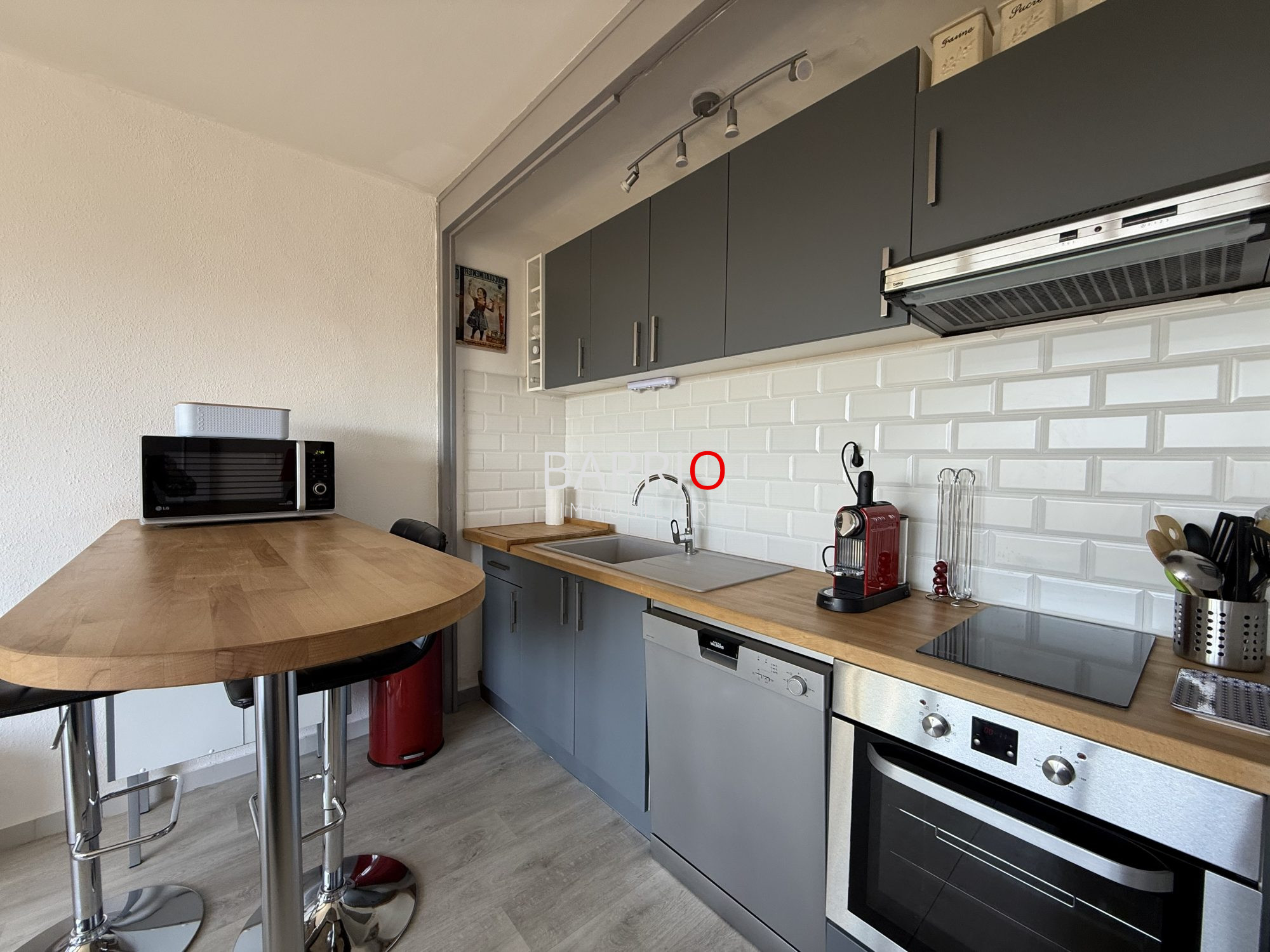 La pièce de vie, climatisée, s'ouvre sur une belle cuisine moderne et conviviale, idéale pour partager des moments agréables. De nombreux rangements viennent compléter cet espace parfaitement optimisé.