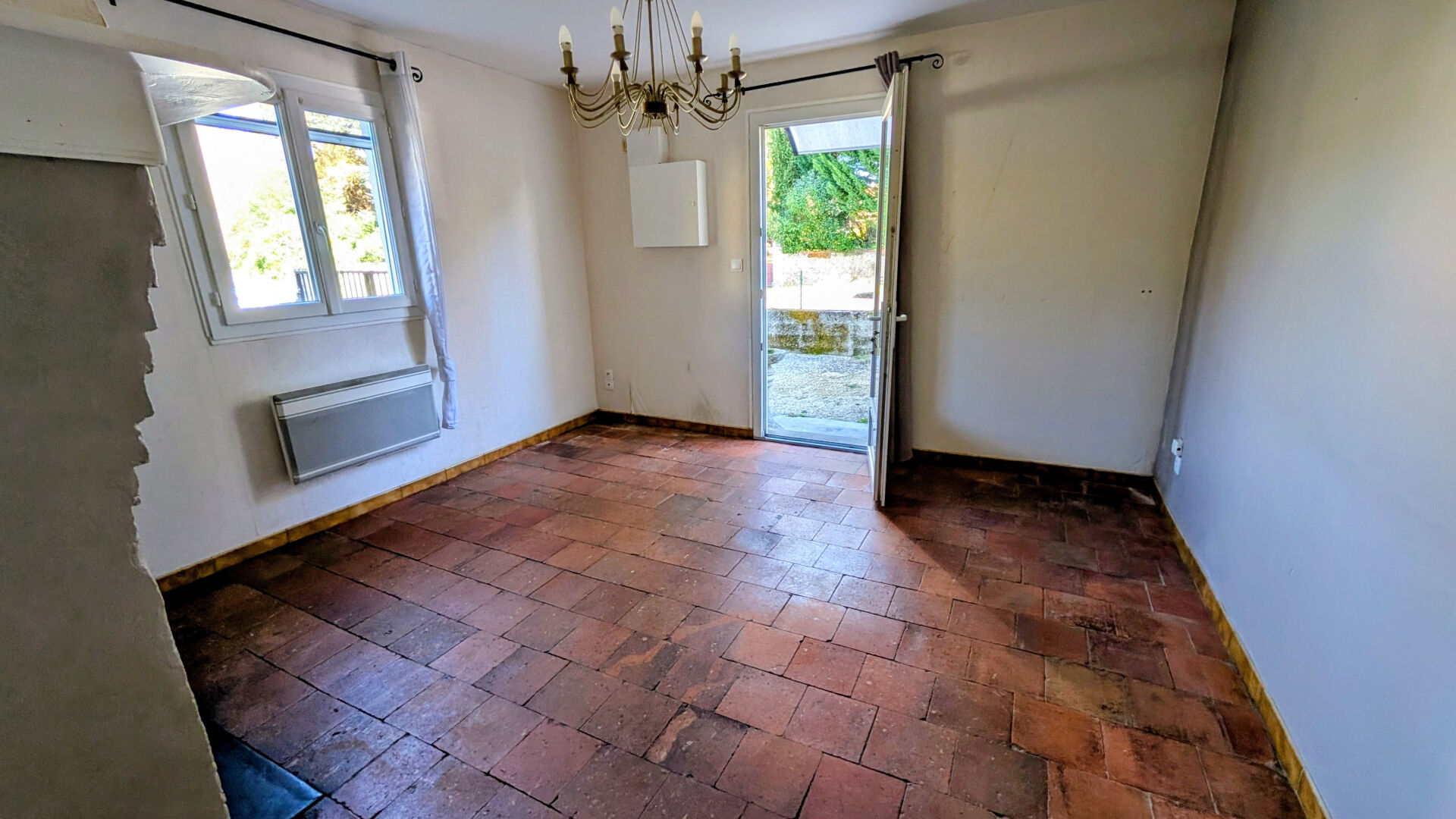En effet, on y entre par un séjour au sol en tomettes, puis on accède à un espace cuisine attenant. La salle d'eau et les wc font également parti du rez de chaussée, dont le descriptif se termine par une grande chambre carrelée.