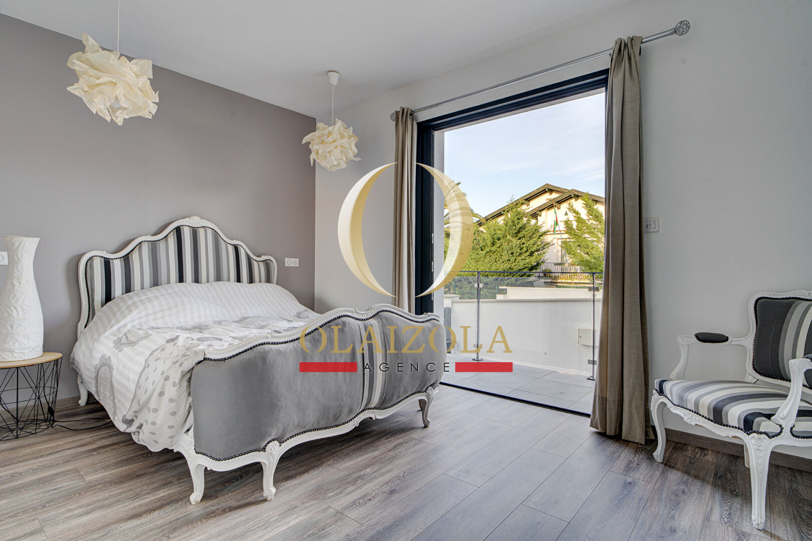 À l'étage, une suite parentale avec salle d'eau et WC bénéficie d'un accès à une terrasse et à un balcon.