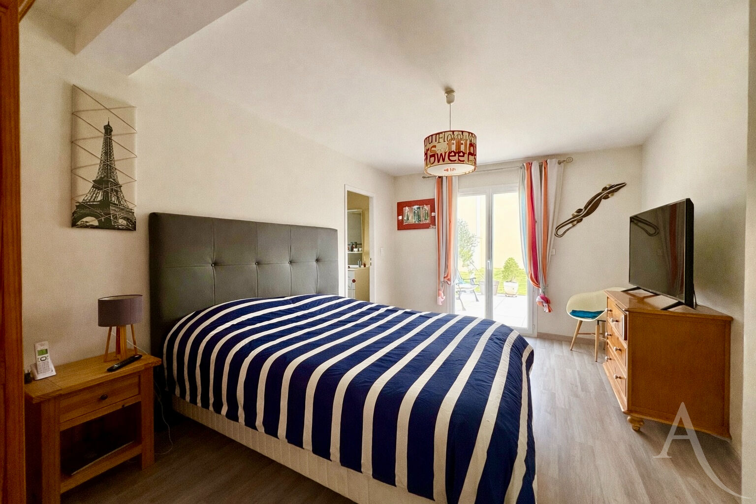 Elle se compose au rez-de chaussée d'un vaste séjour-salle à manger de plus de 60 m² avec grandes baies vitrées, d'une cuisine ouverte aménagée et équipée, ainsi que de deux suites parentales.