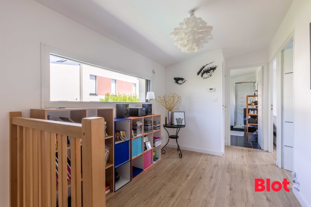 La visite se poursuit au 1er étage avec une spacieuse mezzanine desservant trois belles chambres dont deux avec placards et une avec dressing, une salle de bains avec douche et baignoire et un WC indépendant.