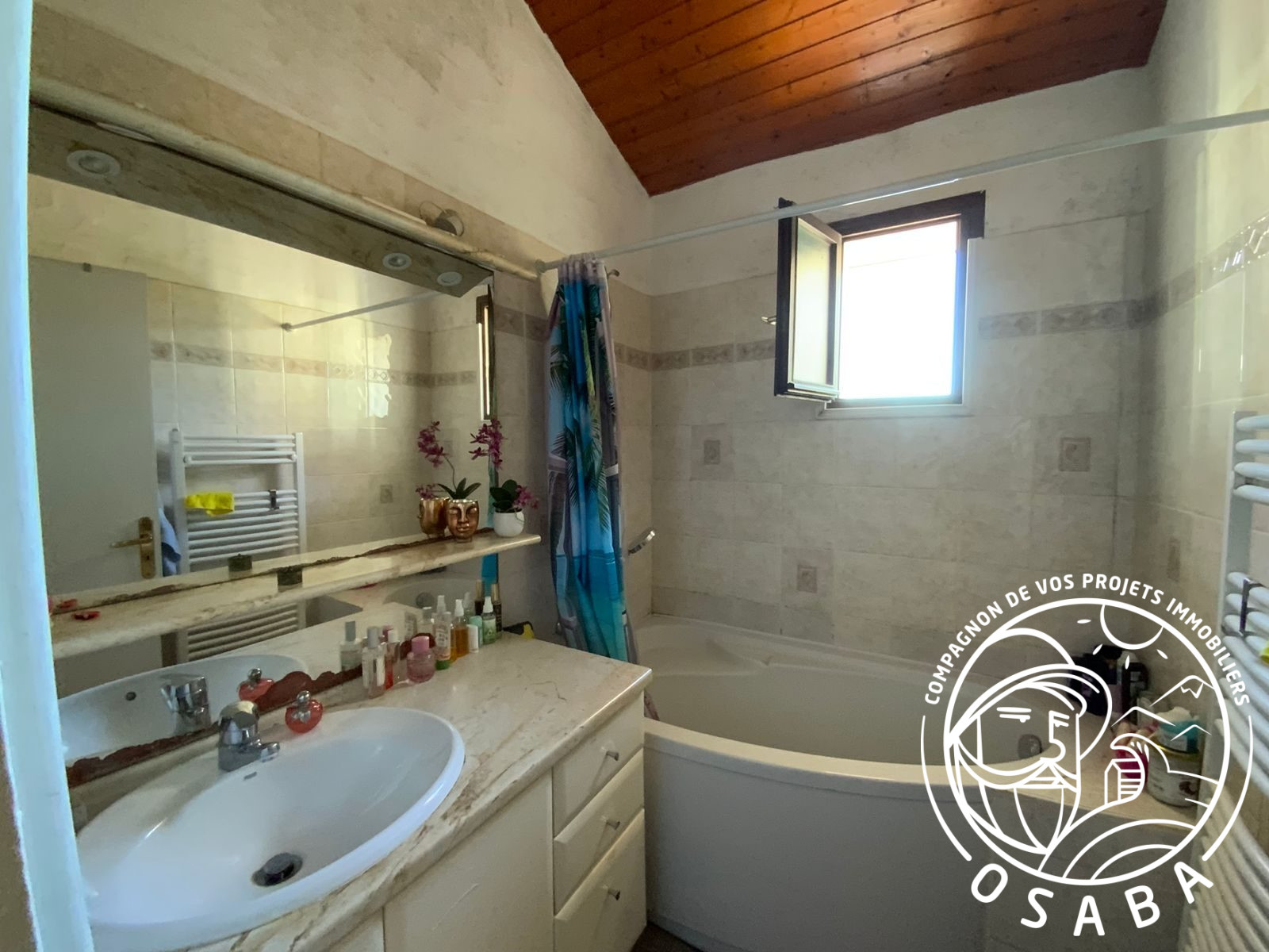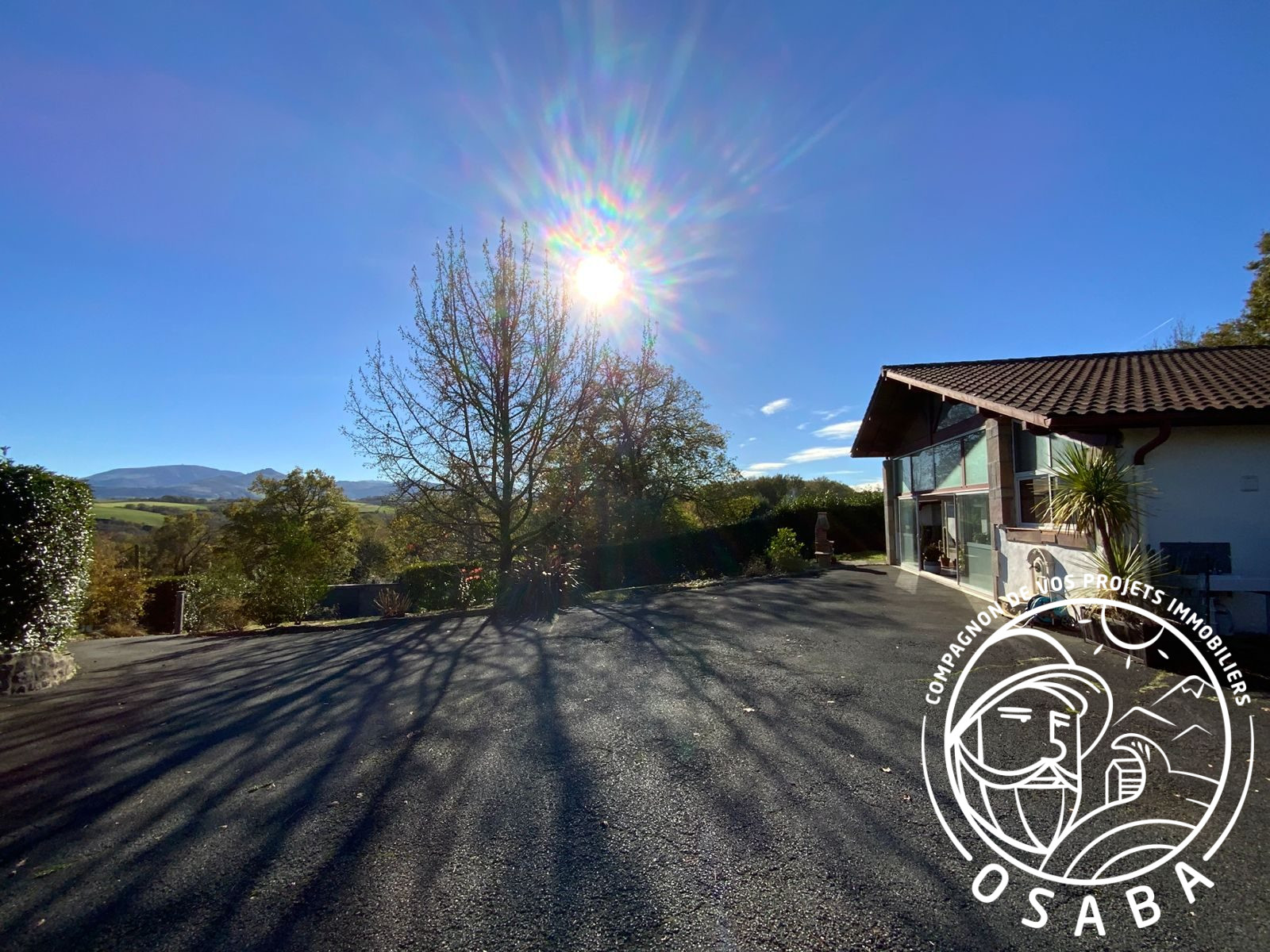 Au quartier des Bois à Ustaritz, avec une belle vue montagnes, Maison d'environ 148 m2 comprenant au rez-de-chaussée : une Veranda avec cuisine d'été, un cellier, une cuisine indépendante équipée, un salon (avec cheminée à insert), 3 chambres dont une avec placard, un bureau, une buanderie, 2 WC, 1 salle d'eau, 1 salle de Bain.