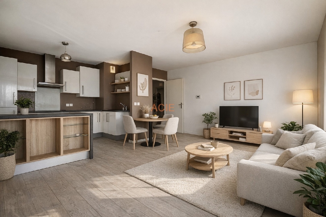 Entrée avec rangement, grand salon-séjour lumineux avec accès balcon, cuisine ouverte, trois chambres avec placard, salle de bains, salle d'eau, wc.