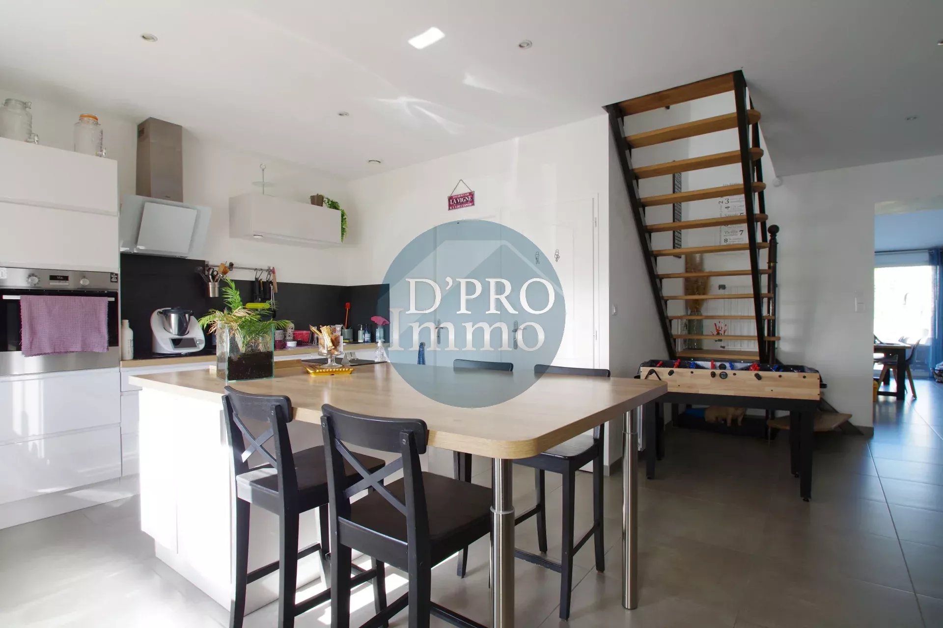 Au rez-de-chaussée, vous serez séduits par une agréable pièce de vie lumineuse avec une belle hauteur sous plafond et son poêle à pellets, idéale pour des moments conviviaux. La cuisine aménagée et équipée, pratique au quotidien, est complétée par une buanderie et un WC.