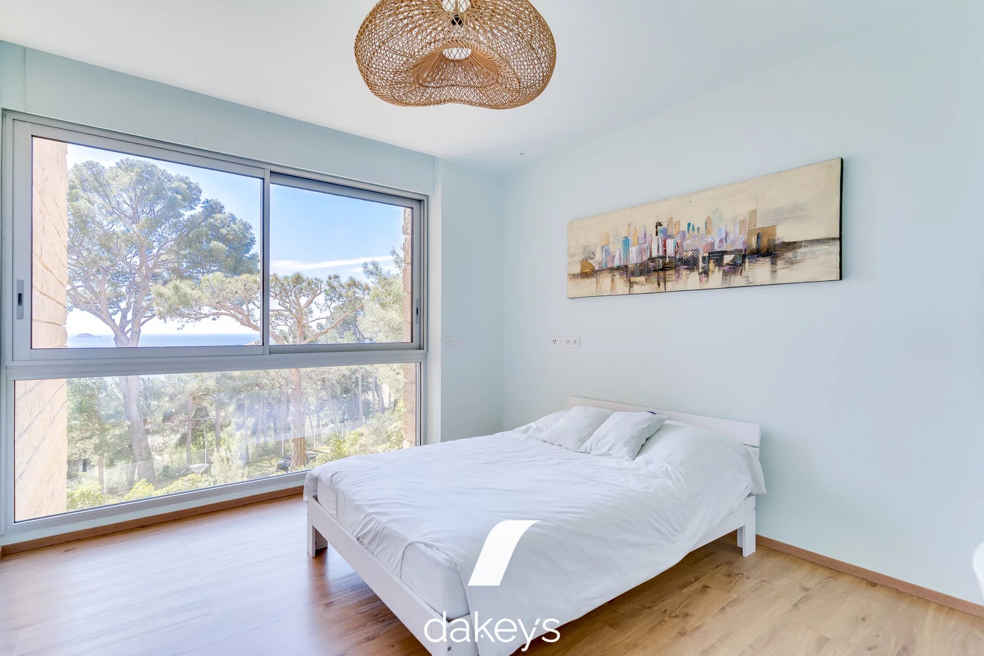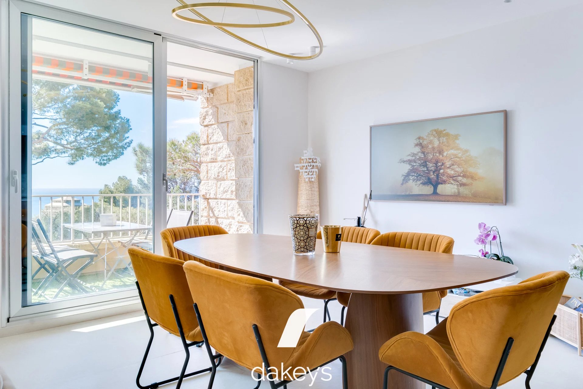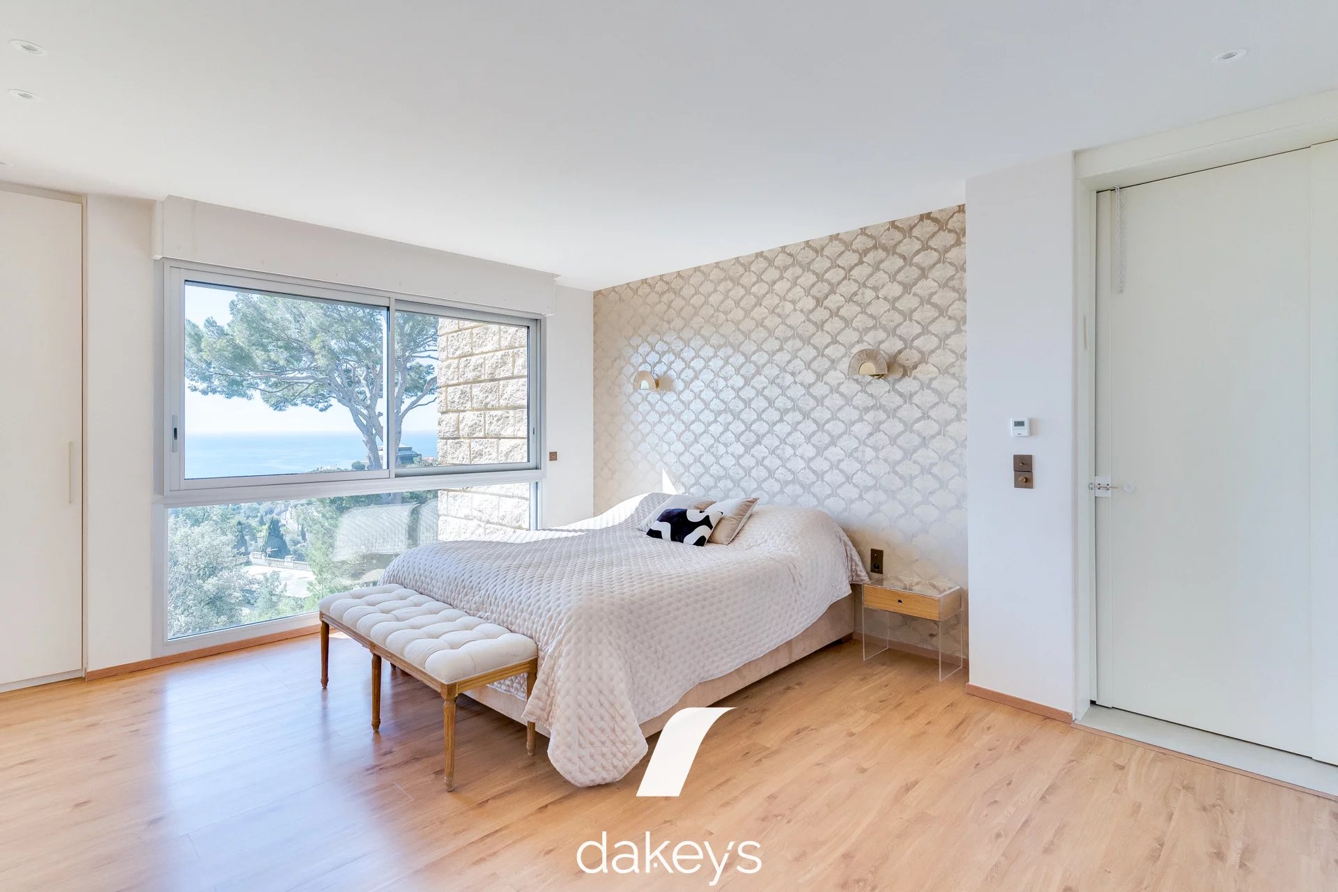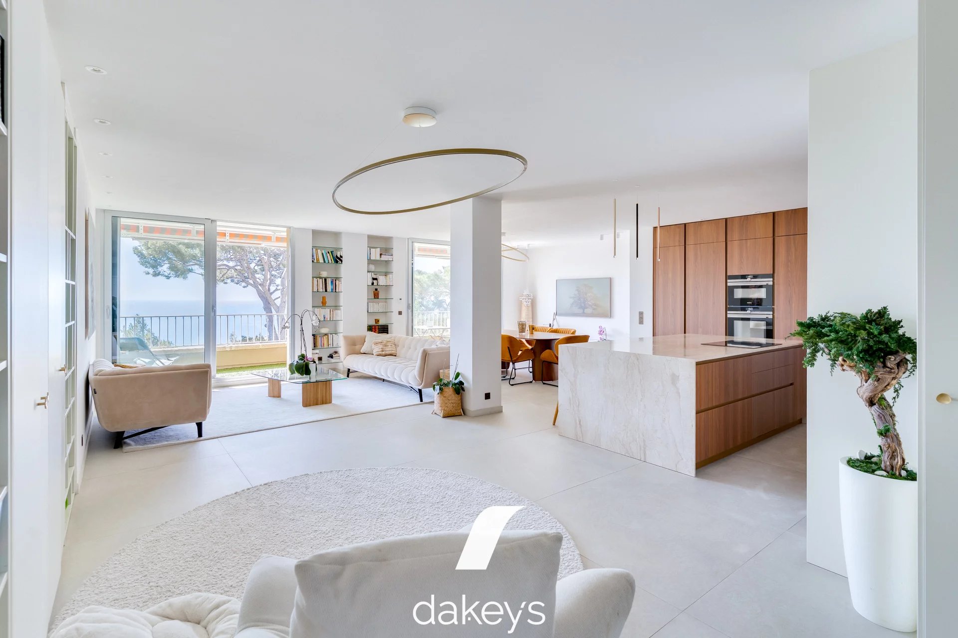 Dès l’entrée, la pièce de réception d’environ 70 m² s’impose par sa luminosité et ses perspectives ouvertes sur la mer. Prolongée par une terrasse de 12 m², elle offre un spectacle permanent, sans vis-à-vis, où l’horizon se confond avec la Méditerranée.